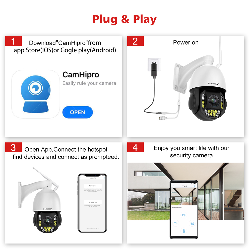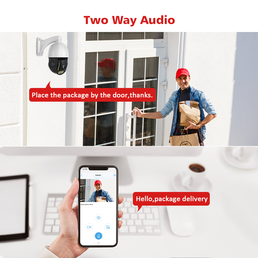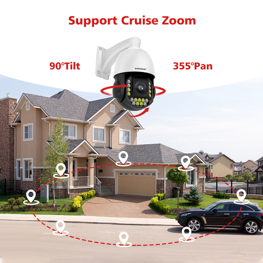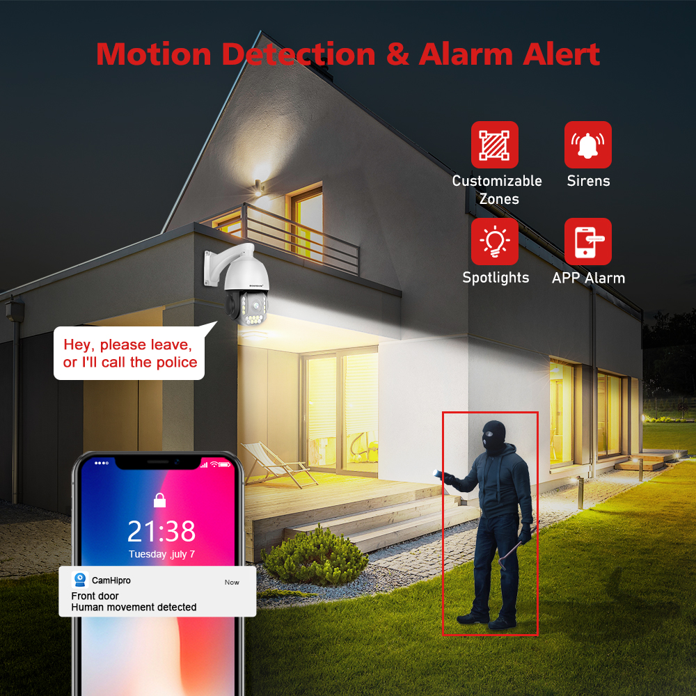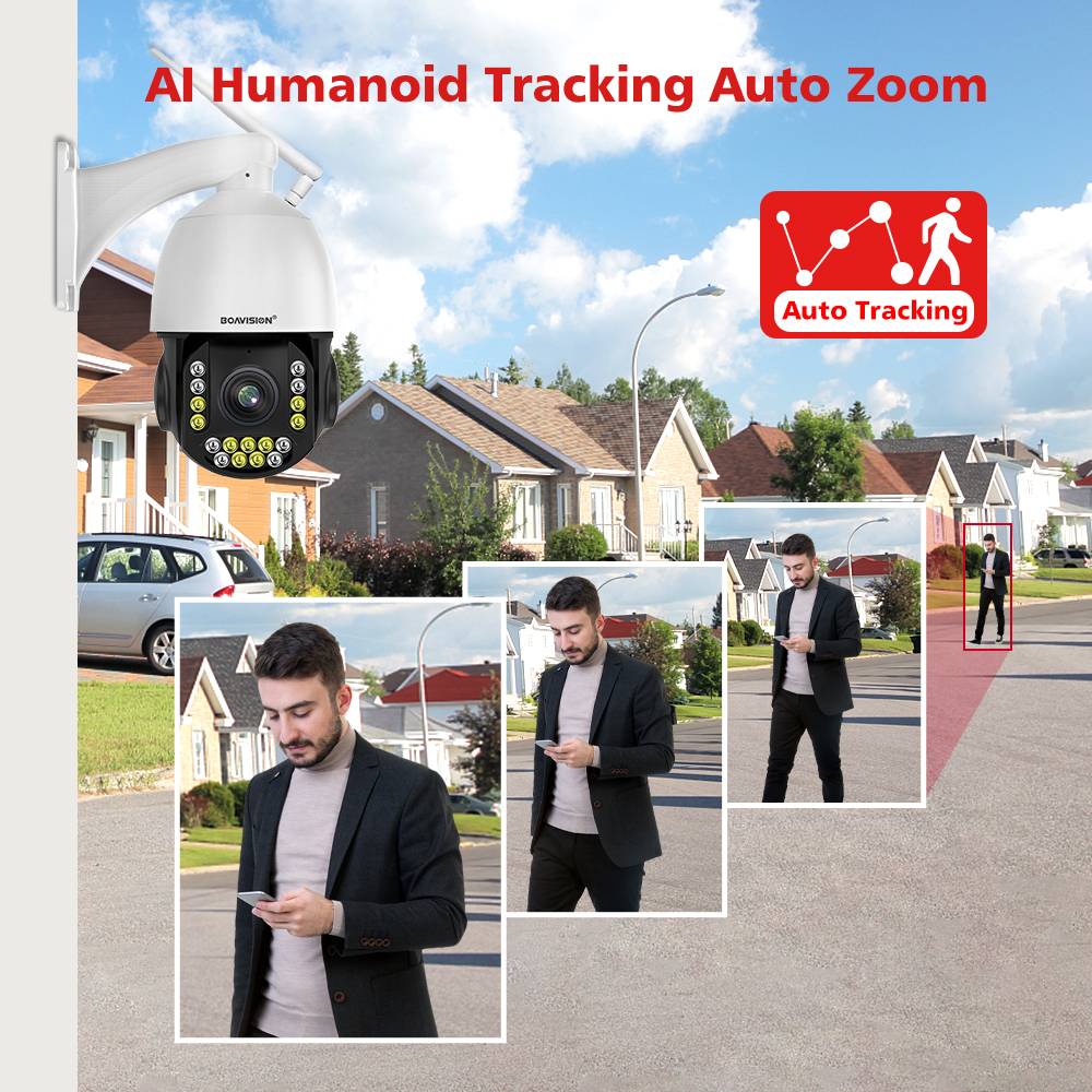 Камера автоматически регулирует вращение панорамирования/наклона и масштабирует, захватывая четкие цели мониторинга и автоматическое отслеживание движущегося человека, а также отправляет оповещения по электронной почте или с уведомлениями на ваш телефон.