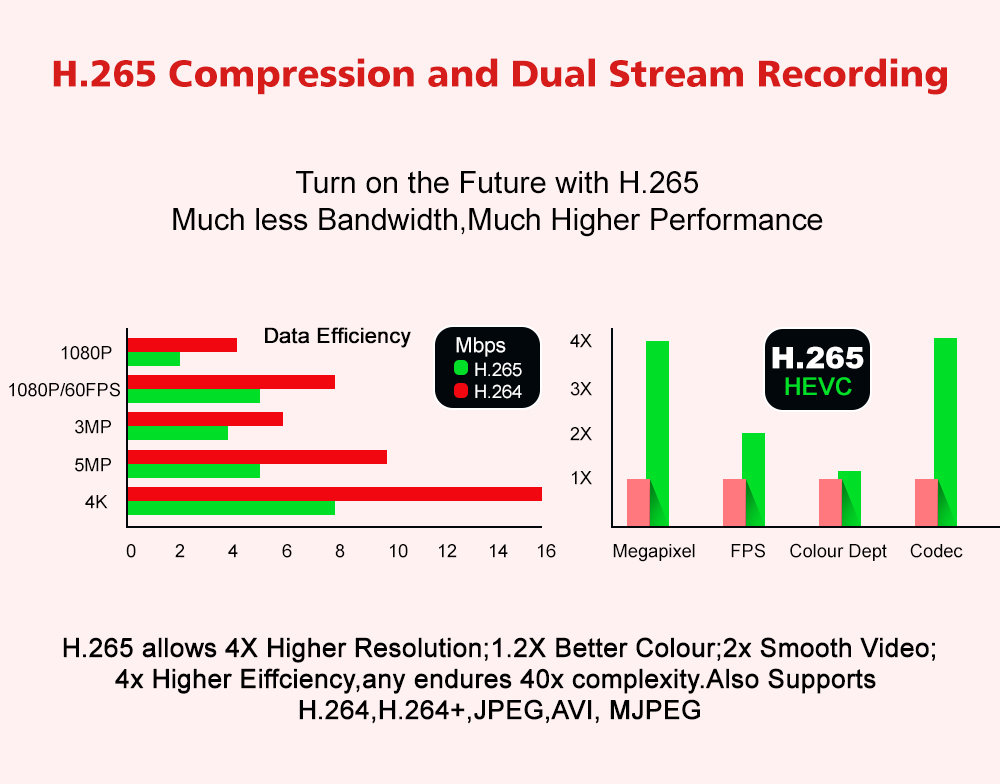 Благодаря расширенному сжатию видео H.265 эффективность полосы пропускания и скорость передачи значительно увеличиваются.