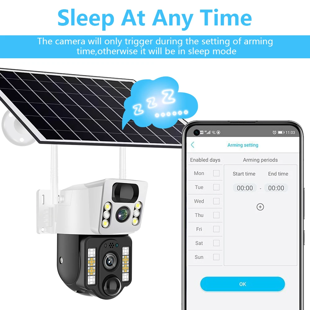 Наша камера на солнечной батарее объединяет интеллектуальные функции энергосбережения и пробуждения по движению, чтобы предоставить вам более длительную защиту от мониторинга и энергосбережение. Эта функция позволяет камере автоматически спать, чтобы сэкономить заряд батареи без ущерба для качества мониторинга, и в то же время автоматически быстро просыпается при обнаружении движущейся цели, записывает экран и отправляет уведомление о тревоге.
