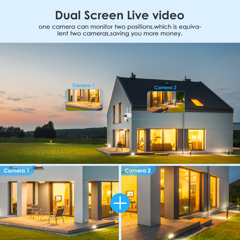 Функция прямой трансляции с двумя экранами камеры наблюдения удивительно практична. Благодаря этой функции одна камера может контролировать два места одновременно, эффективно обеспечивая функциональность двух камер и экономя вам больше денег.