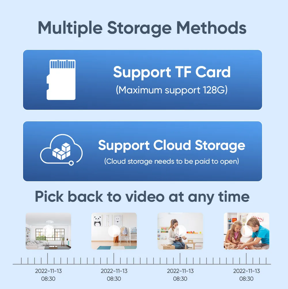 6. Поддержка хранения TF с максимальной поддержкой карт 128 ГБ. Он также поддерживает Облачное хранилище APP (требуется подписка).