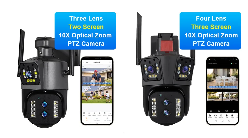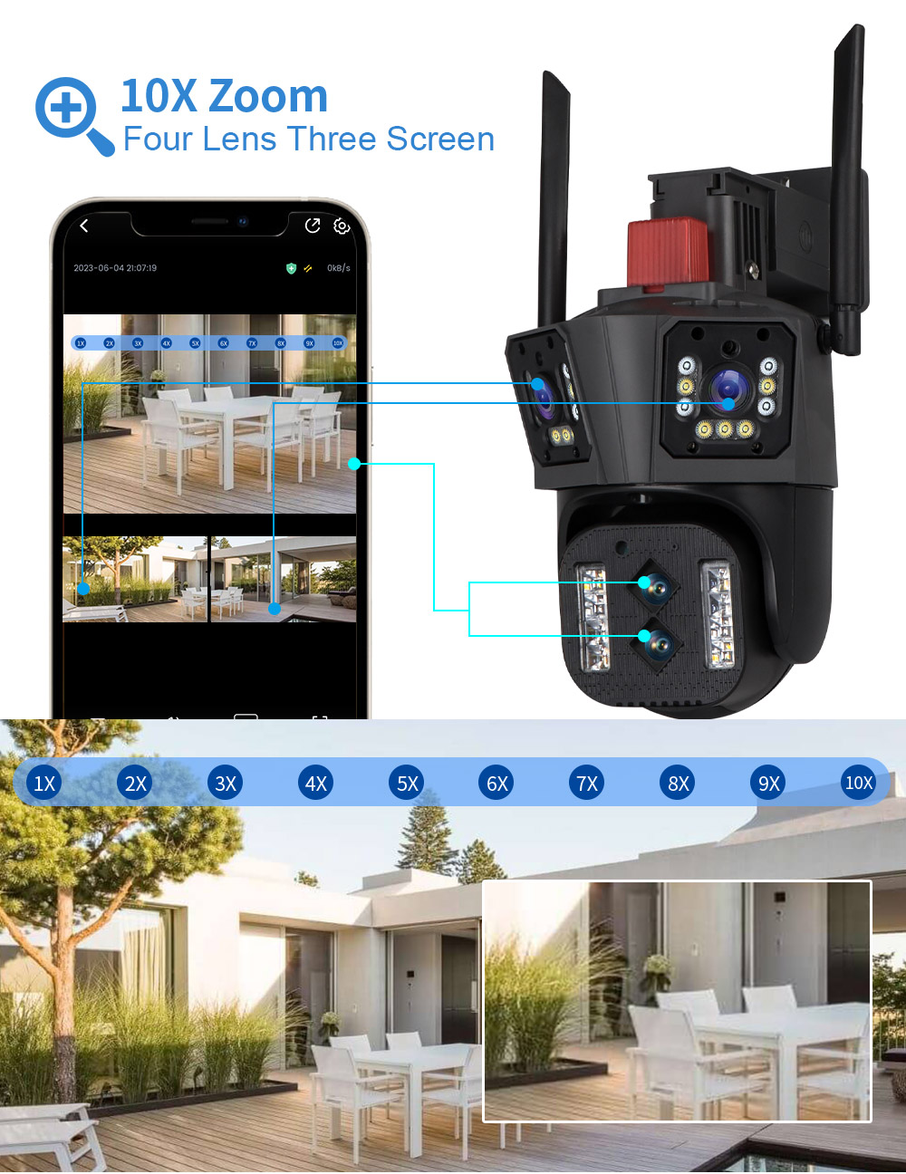 Четыре объектива и три экрана 10-кратный зум камеры: Ультра широкоугольный, 4 мм + 4 мм + 6 мм + 16 мм, смешанный зум = 3-кратный оптический зум + 10-кратный цифровой зум, достижение четкого мониторинга дальних и ближних расстояний.