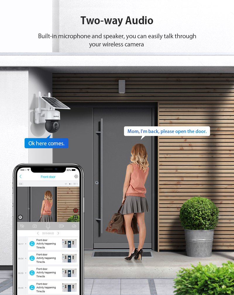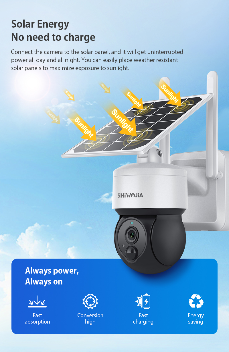 Подключите камеру к солнечной панели, и она будет получать бесперебойную мощность весь день и всю ночь. Вы можете легко разместить устойчивые к атмосферным воздействиям солнечные панели для максимального воздействия солнечных лучей.