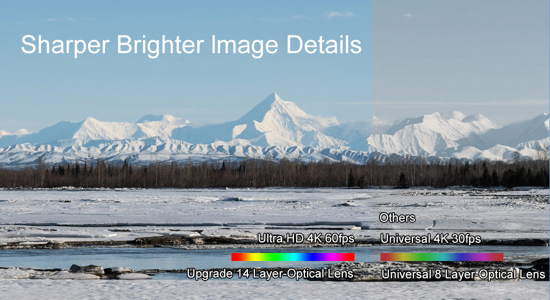 Используйте 1/1. 8-дюймовый высококачественный UHD CMOS-датчик с максимальным количеством 8.42 миллиона пикселей могут реализовать 4K (3840x2160) 60 кадров в секунду сверхвысокого разрешения и высококачественные изображения. И вниз совместим с 1080p, 720p и другими разрешениями.