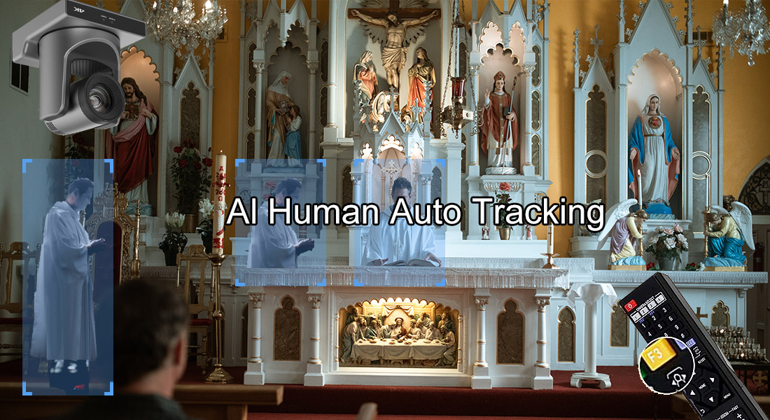 Благодаря вычислительной мощности чипа AI камера оснащена передовыми алгоритмами AI для реализации монокулярного отслеживания гуманоидов, камера слежения AI будет автоматически панорамировать/наклонять/масштабировать, чтобы следовать ведущей роли, когда они ходят, в сочетании с технологией автоматической композиции. Главный герой всегда находится в центре экрана.Которые могут осуществлять автоматическое отслеживание сцен, таких как церковное богослужение, обучение, конференции и прямые трансляции.