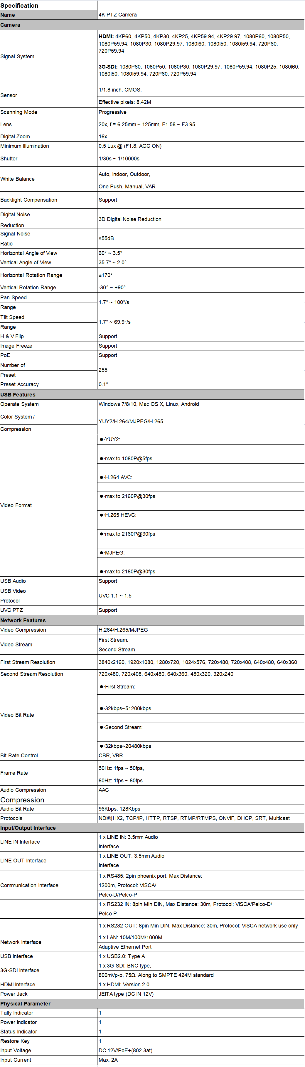 • Протоколы управления IP/IR/NDI/Pelco-D/Pelco-p/RS-232/RS-485/Visca