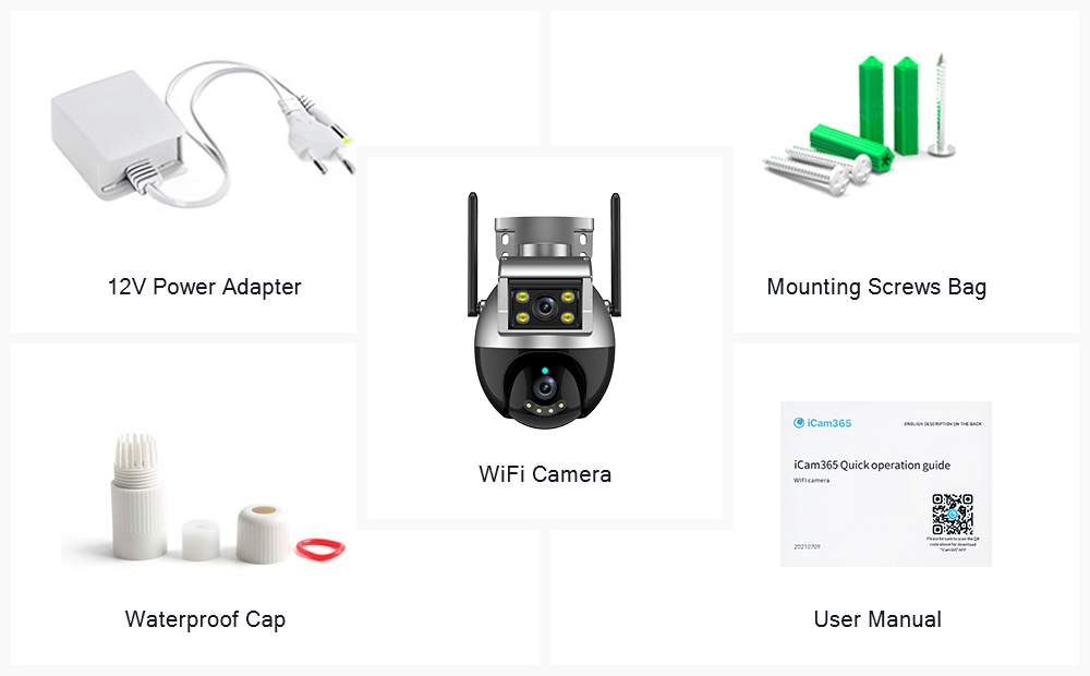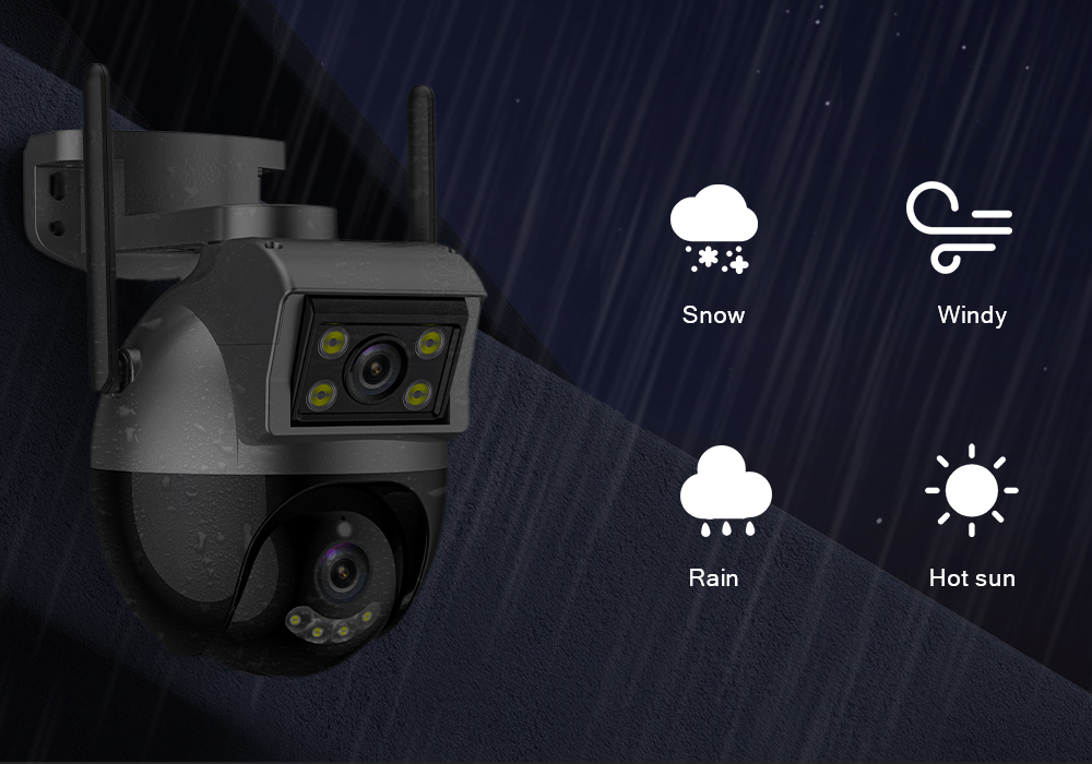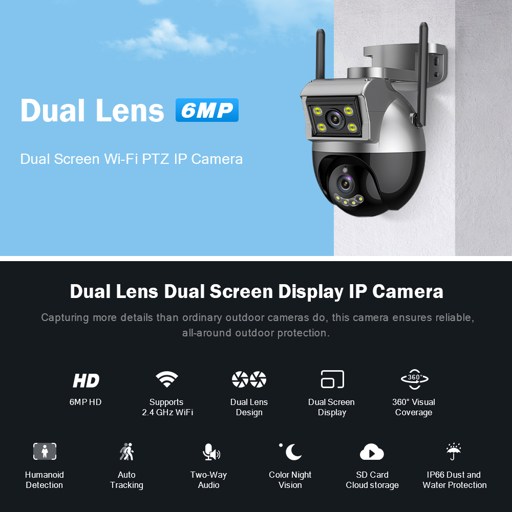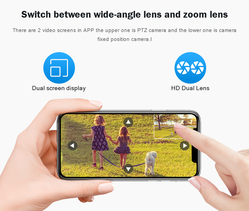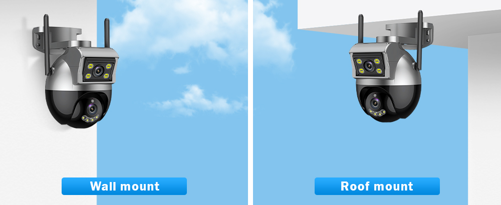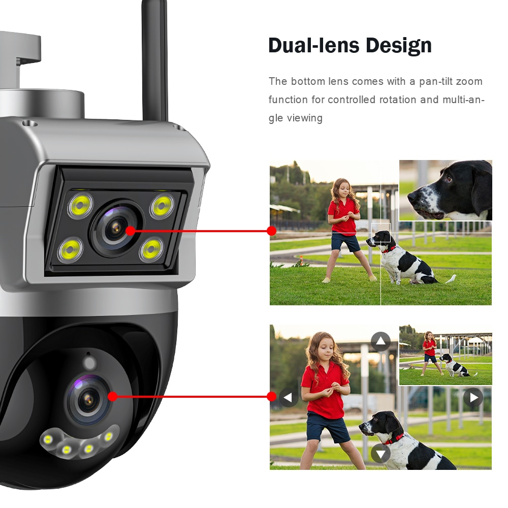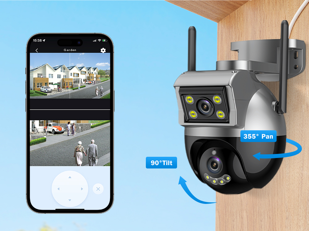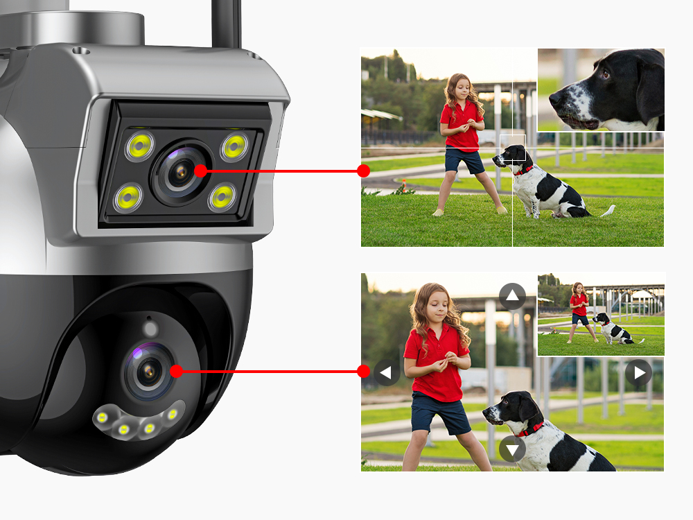 Камера оснащена двумя объективами, а нижний объектив оснащен функцией панорамирования и наклона, которая может управлять вращением и обзором с разных углов, реализация двухэкранного дисплея и многоугольного просмотра.