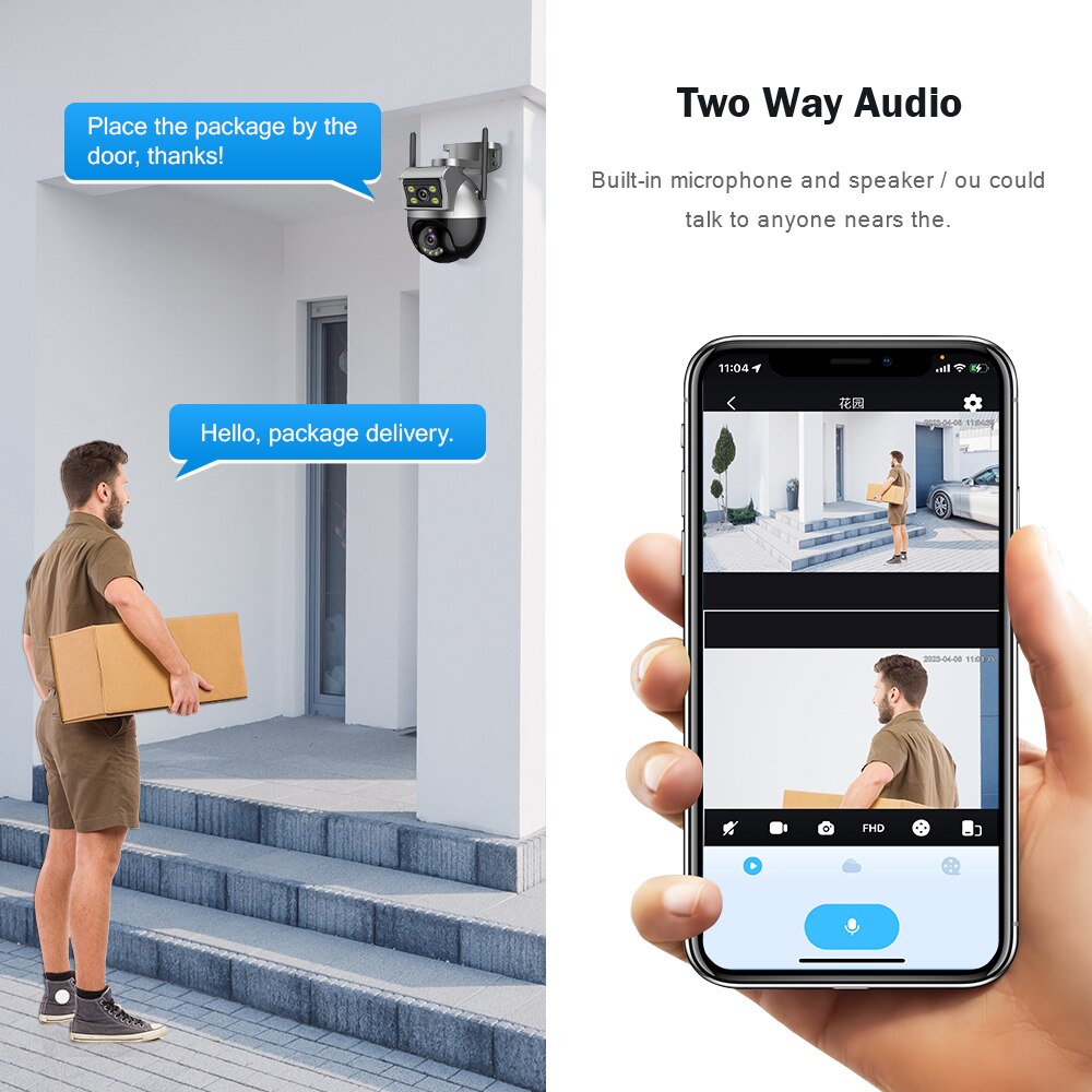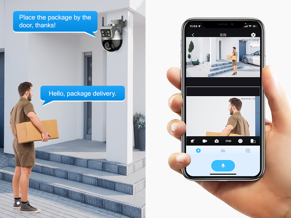 PTZ IP-камера с тремя объективами и двойным экраном оснащена встроенным динамиком и микрофоном, которые можно использовать для голосовой связи в любое время через приложение для мобильного телефона.