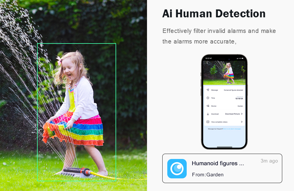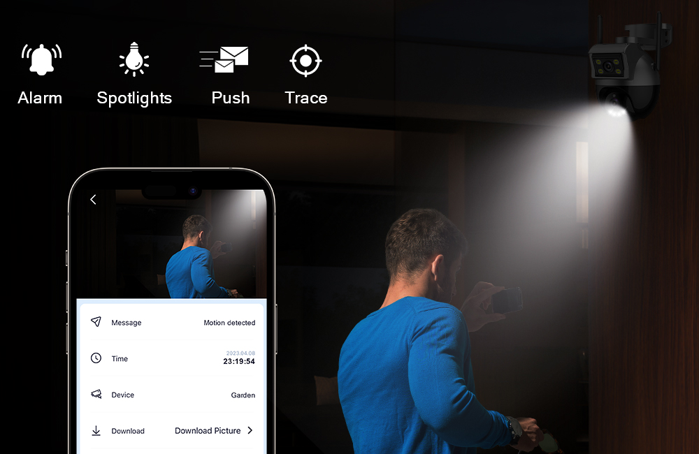 После блокировки цели камера автоматически регулирует вращение панорамирования, отслеживая движущиеся объекты, автомобили, домашних животных, людей и push-уведомления на ваш смартфон.