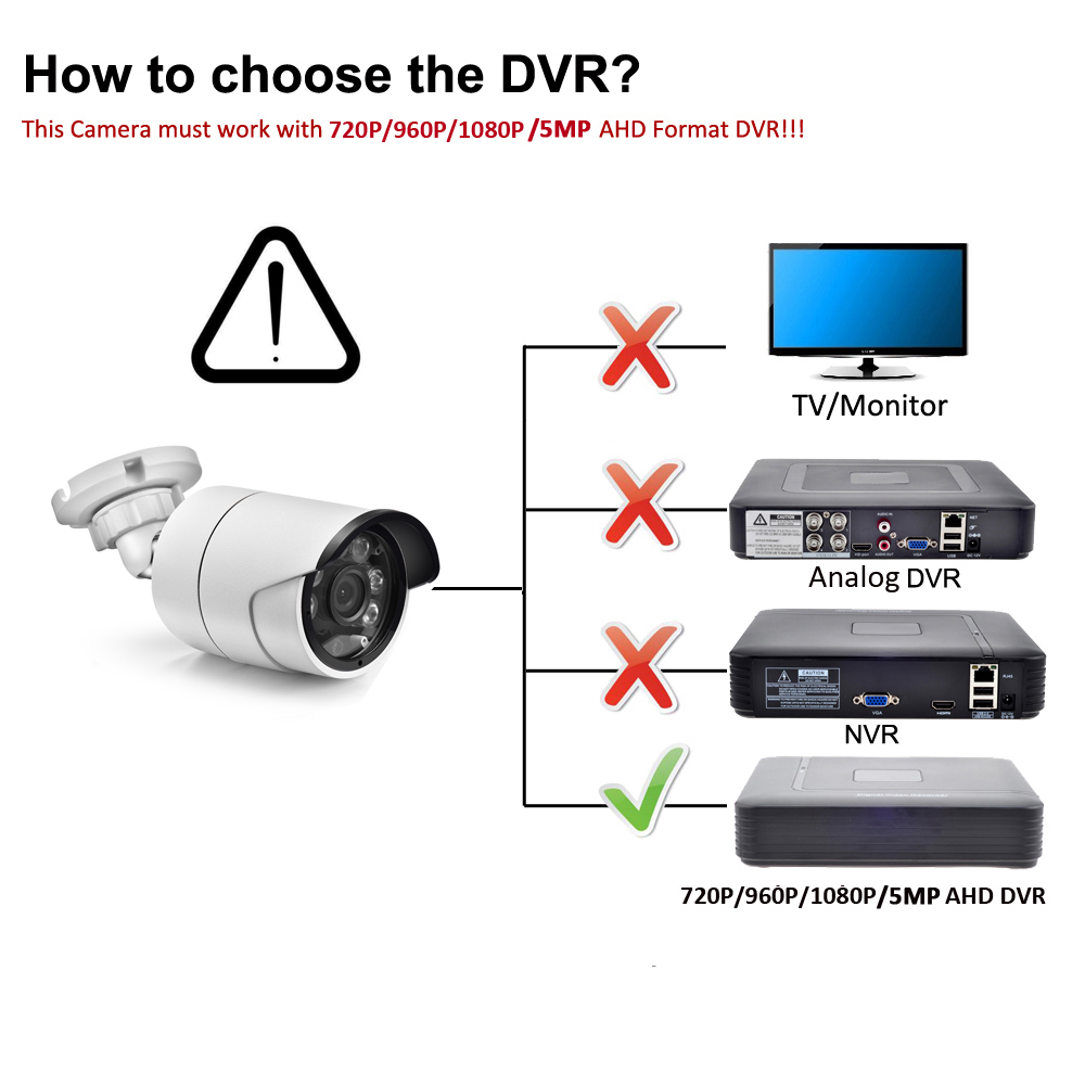 Убедитесь, что у вас есть видеорегистратор AHD для камер AHD. Без него Вы не сможете просматривать или записывать. Это очень-очень важно! Пожалуйста, не покупайте его, если у вас нет видеорегистратора AHD!НАЖМИТЕ Изображения ниже, чтобы увидеть AHD DVR, который мы распиливаем: