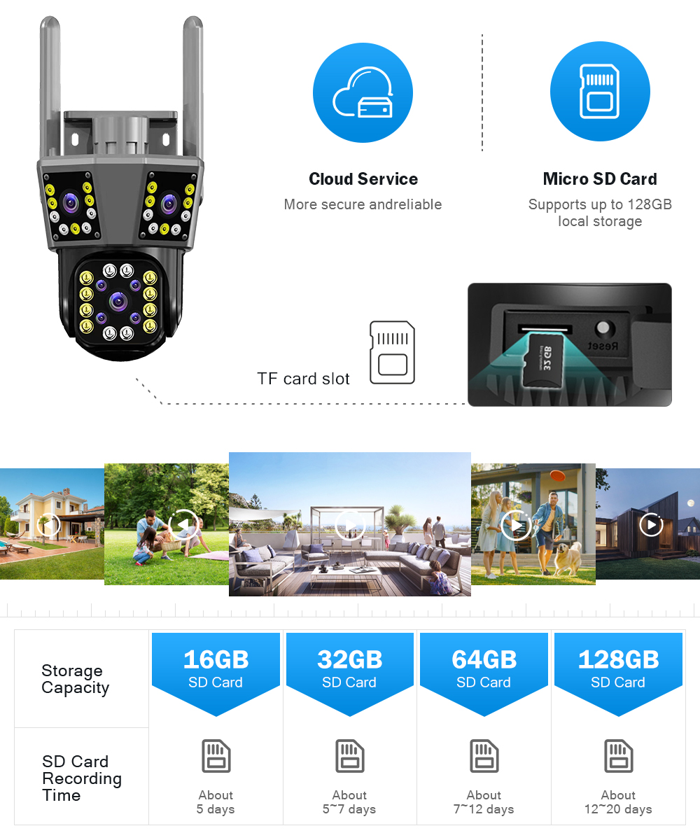 * Вставьте TF-карту объемом до 128 ГБ (TF можно выбрать по мере необходимости), что поможет вам сохранить видео, которое вы не хотите удалять.