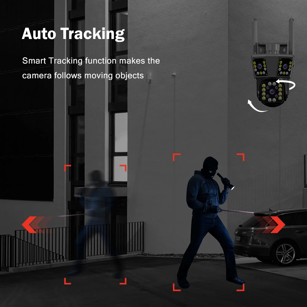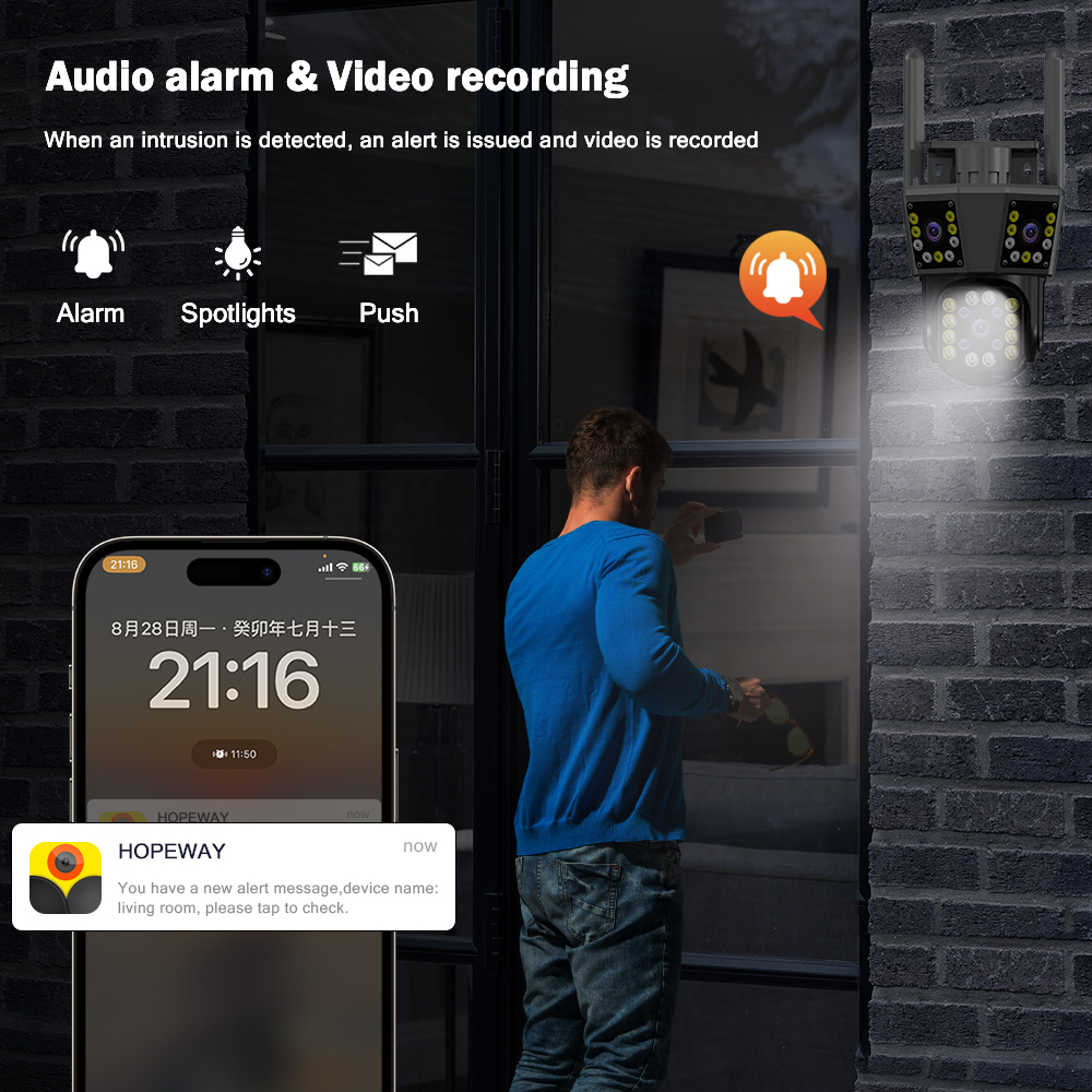 * При обнаружении движения человека камера будет отслеживать движение человеческого тела, излучать свет и отправлять сигналы тревоги в реальном времени.