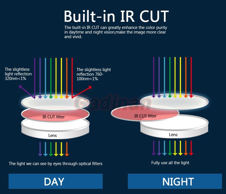 Камера имеет очень хорошее качество ночного изображения. Инфракрасный фильтр для обеспечения высочайшего качества изображения-днем и ночью. В течение дня инфракрасный фильтр опускается перед линзой, чтобы блокировать попадание инфракрасного света. Это гарантирует, что они не влияют на цвета отснятого материала. Когда уровень освещенности становится слишком низким, этот фильтр автоматически отключается, чтобы инфракрасный свет попадал в объектив камеры. Это когда Полноцветное Изображение превращается в Монохромное черно-белое.