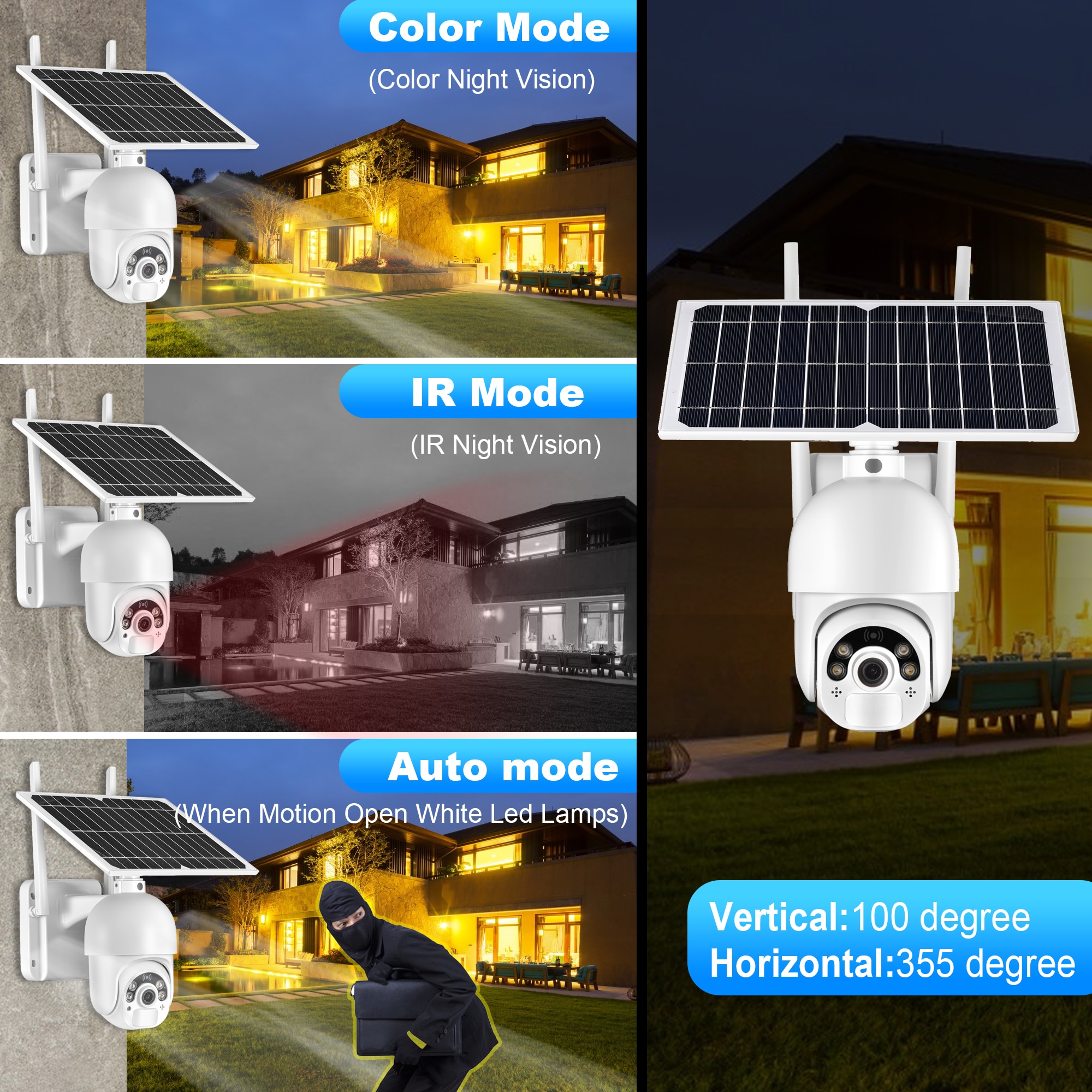 Gadinan эта Солнечная PTZ камера, встроенная в 4 шт. белый светодиодный светильник, есть 3 режима ночного видения на выбор в приложении, откройте Интеллектуальный двойной светильник, Режим цветного ночного видения сейчас! (ИК расстояние 30 метров, белый светильник расстояние 30 метров). Улучшенное ночное видение и низкий светильник.
