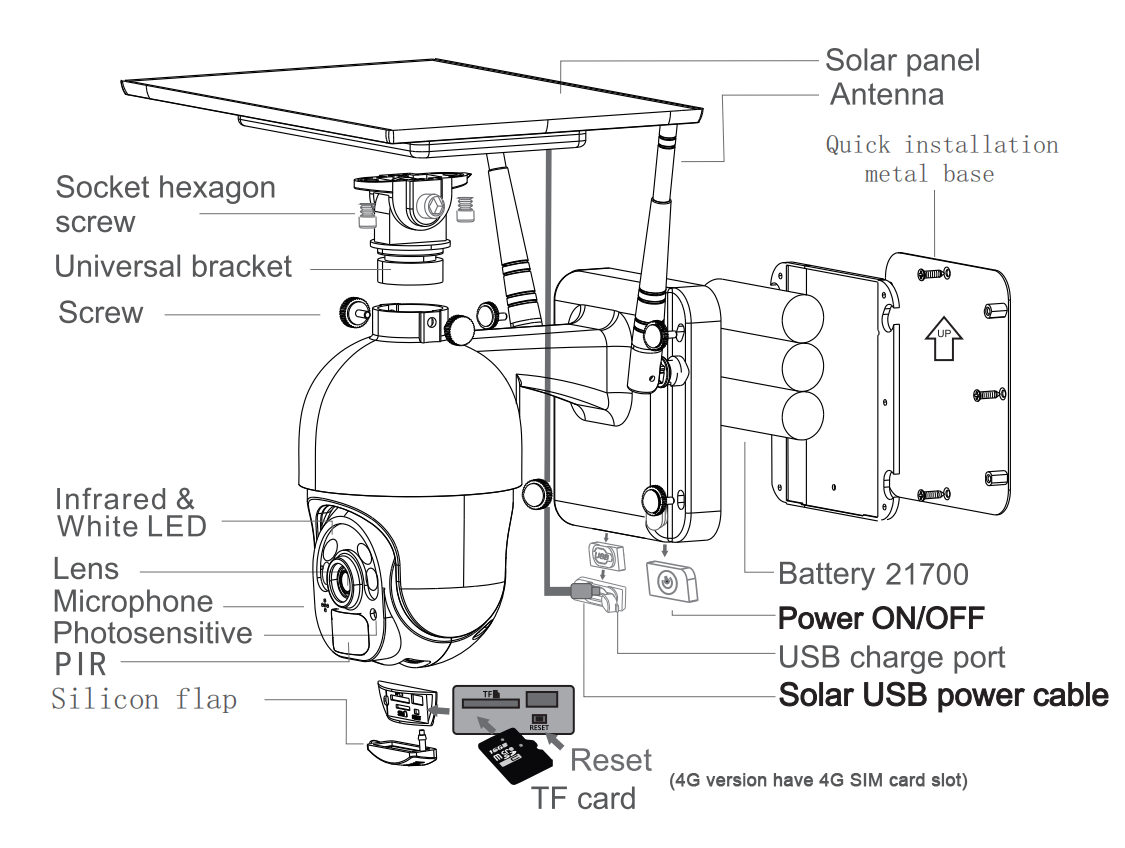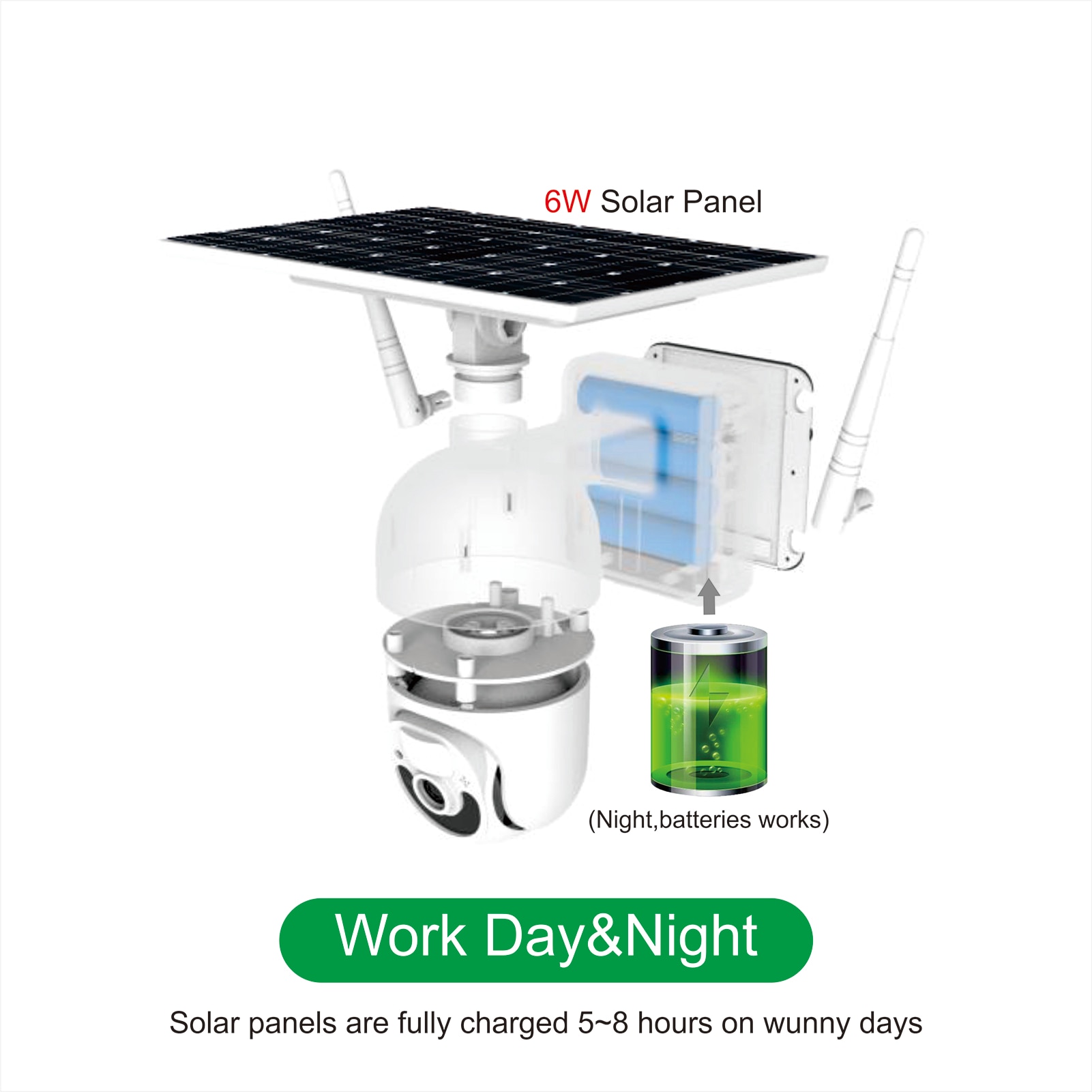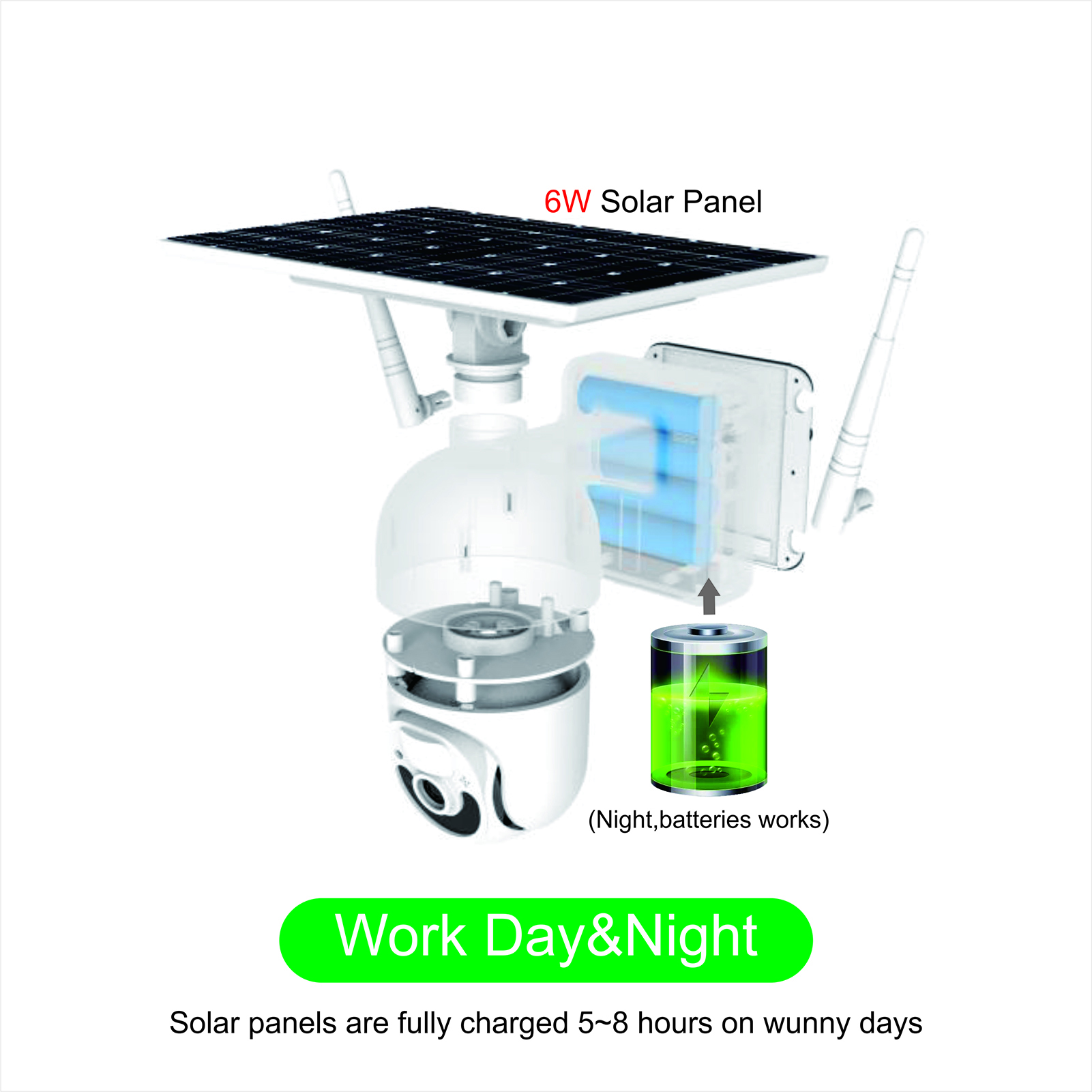 Независимо от солнечной панели 6 Вт, в солнечный день Солнечный свет даст питание камере и поможет зарядить аккумулятор, в несолнечный день, встроенный 3 шт 21700 батареи, 14400ма может работать до 180 дней, это низкое потребление камеры.