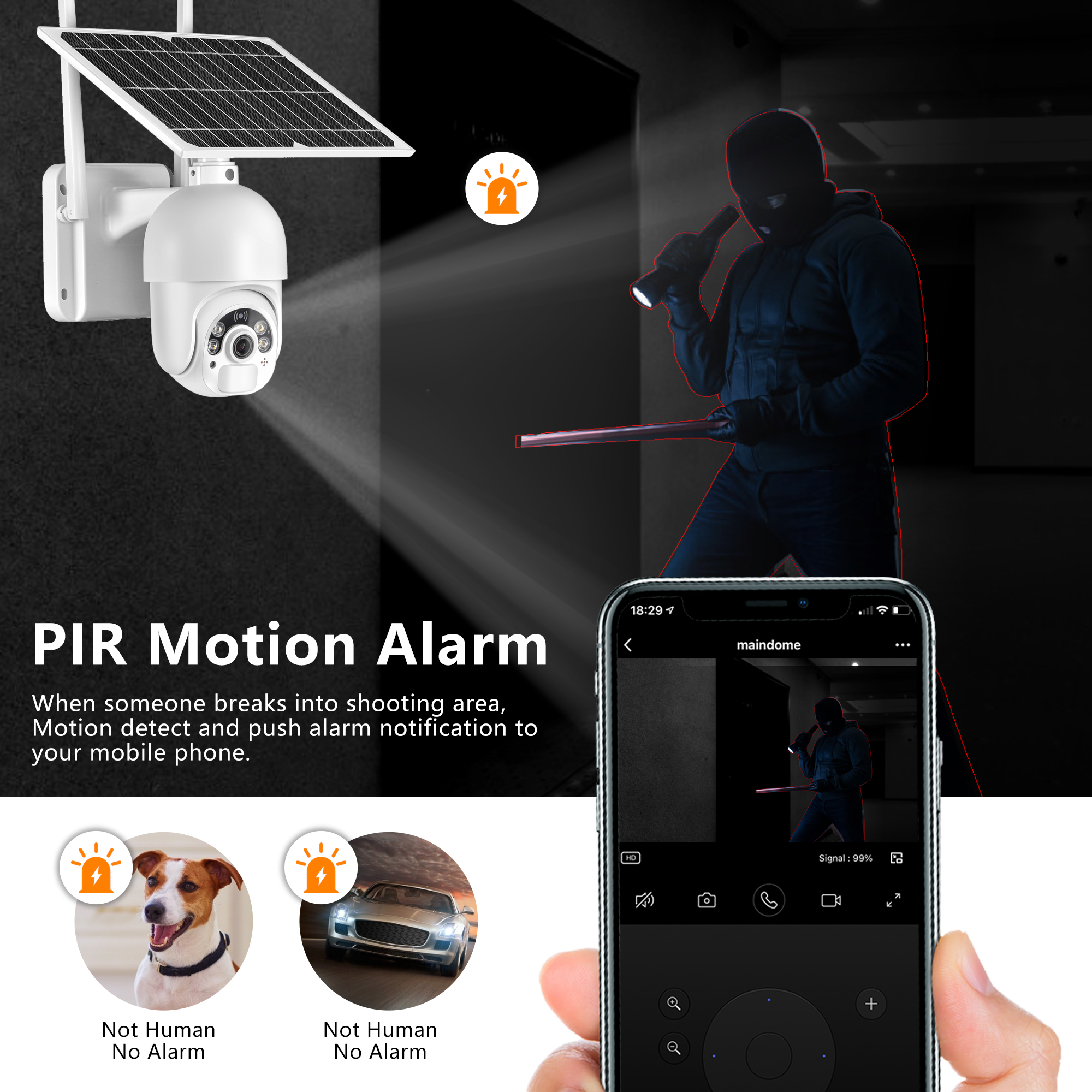 Эта камера безопасности батареи ptz использует высокочувствительный датчик движения PIR и радар-детектор для двойного управления и уменьшения ложных сигналов тревоги,