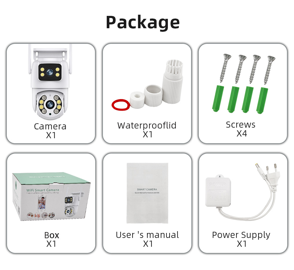 Двойной объектив, Двойной экран, Уведомления о тревоге, гуманоид слежения, двухсторонний голосовой домофон 360 мониторинга, полноцветный ночного видения, IP66 водонепроницаемый, мобильный телефон удаленного мониторинга, обмениваться видео, SD-карты памяти, 24-часовая запись видео