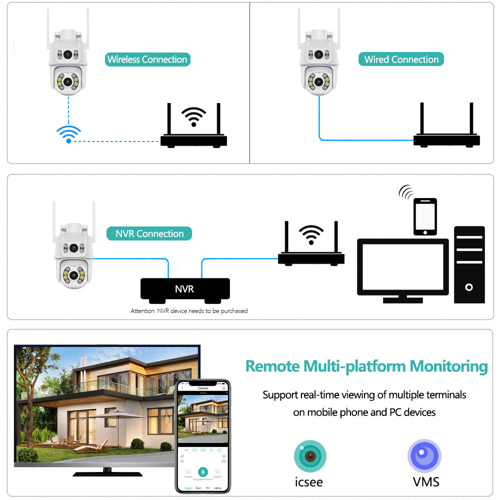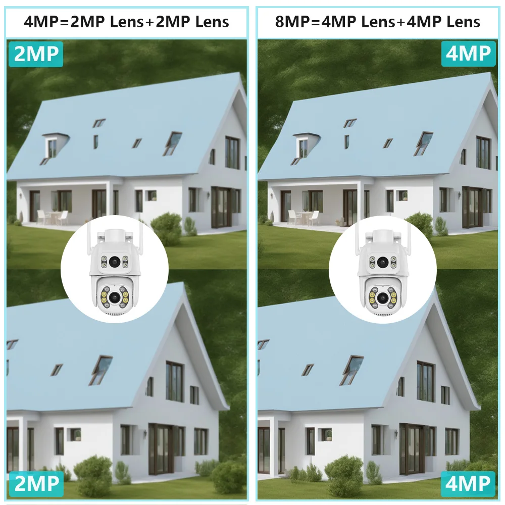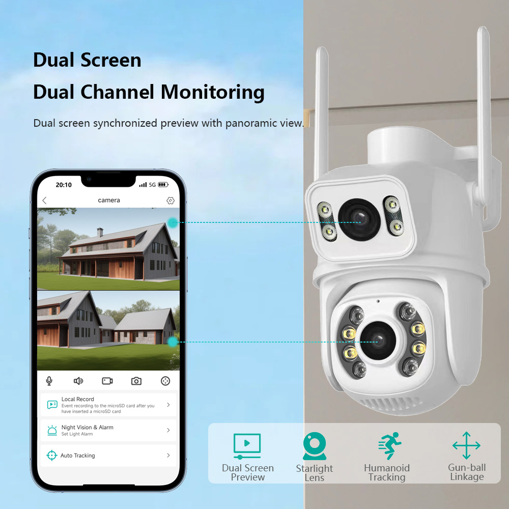 * Двойной экран с двумя датчиками и двумя объективами, широкоугольный обзор на 360 ° + Просмотр на большом расстоянии для достижения четкого мониторинга издалека и вблизи;