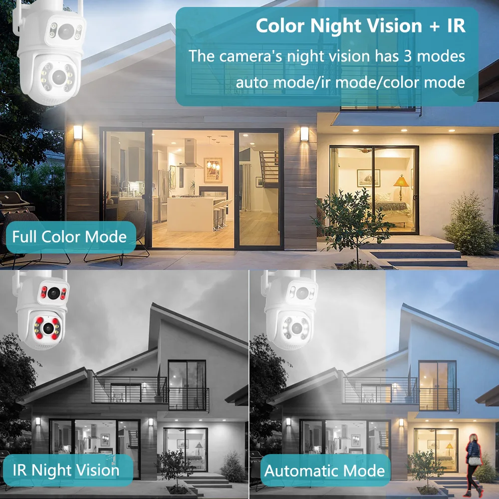 Эта камера встроена в инфракрасный светодиод сверхдальнего действия и светодиодный прожектор, которыми можно полностью управлять в приложении для мобильного телефона, и может просто и быстро переключаться между нормальным/интеллектуальным/полноцветным режимами ночного видения.