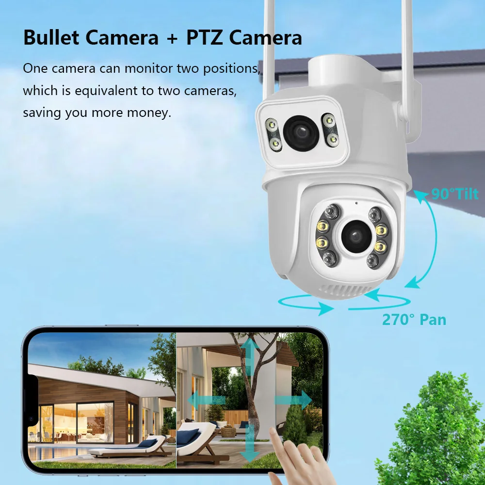 Благодаря горизонтальному 270 ° и вертикальному 90 ° вы можете удаленно управлять наружной камерой Wi-Fi, чтобы просматривать каждый угол с помощью мобильного телефона.