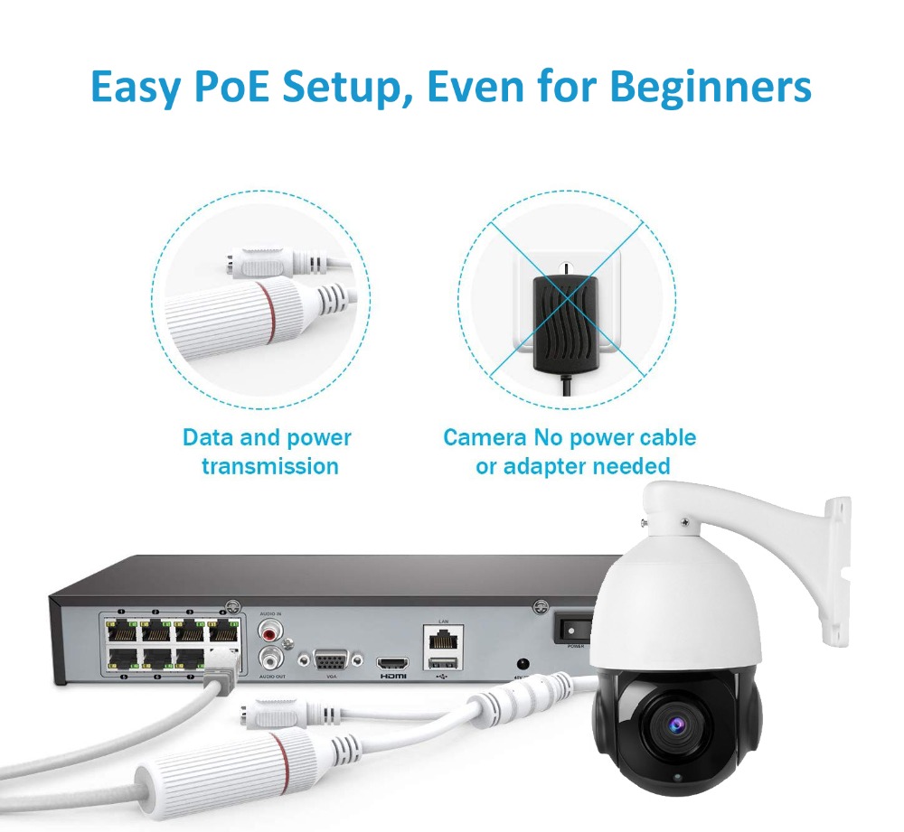 Настоящая система безопасности plug and play! Он оснащен PoE (Power Over Ethernet) с одним кабелем, соединяющим каждую IP-камеру с NVR как для источника питания, так и для передачи видеосигнала. Простота подключения-Процесс подключения не может быть проще для энтузиастов DIY и новичков.