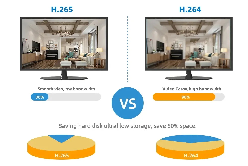 Сэкономьте 50% места для хранения. Обеспечивает до 50% отличное улучшение пропускной способности, более высокую скорость передачи изображения и более плавную скорость воспроизведения видео