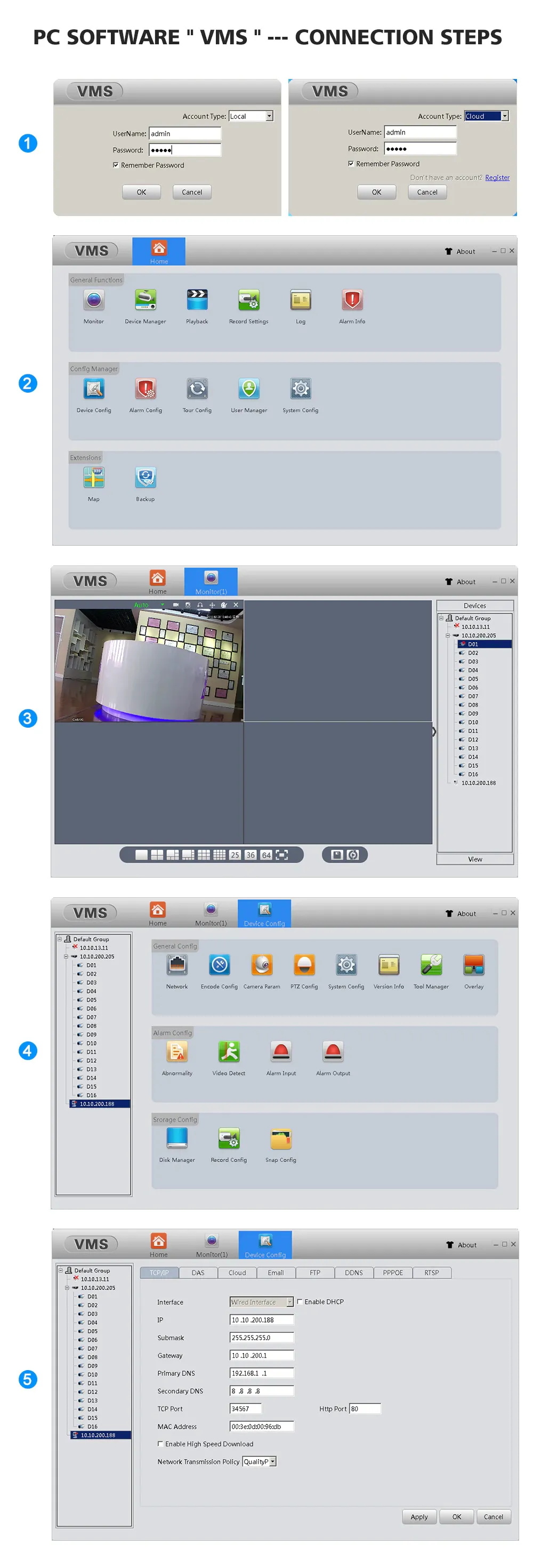 ① Имя пользователя и пароль программного обеспечения VMS являются администраторами.
