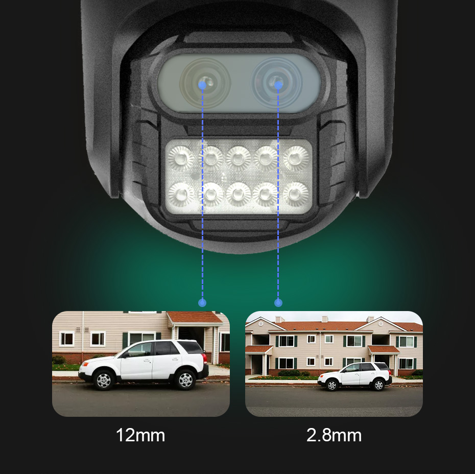 Двойной объектив 2,8 мм + 12 мм для большего расстояния.