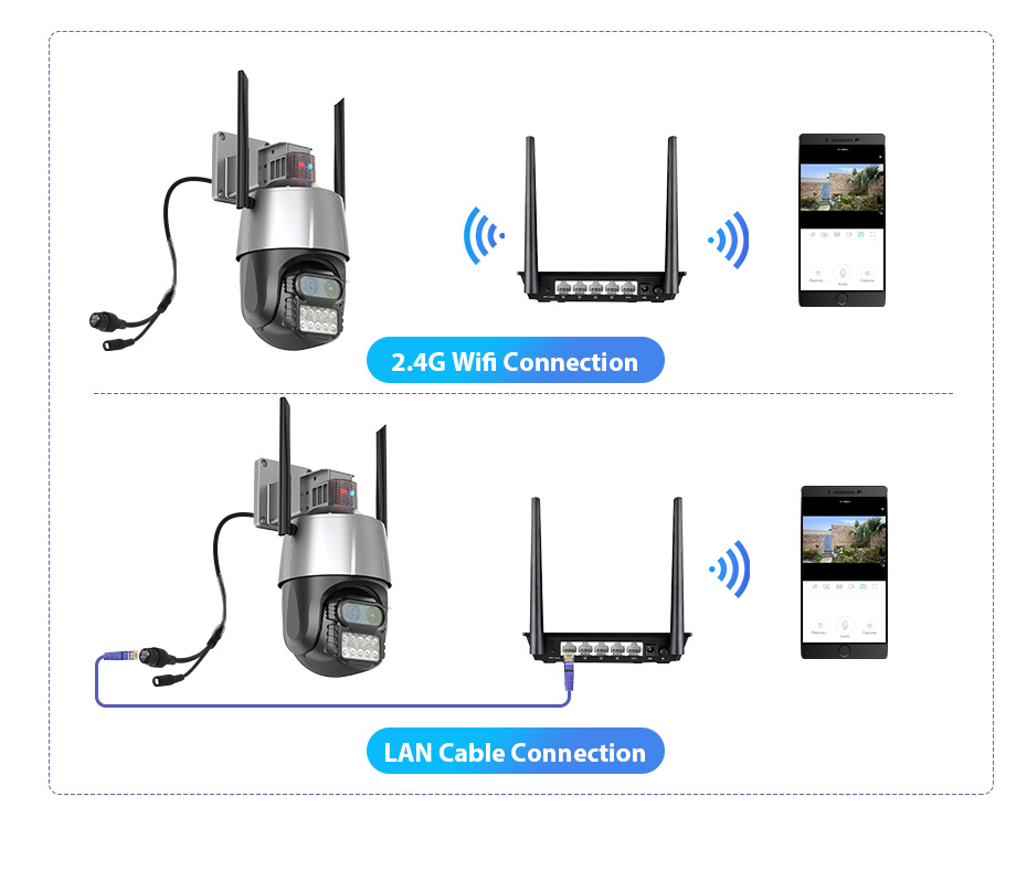 Питание от адаптера DC12V позволяет подключить камеру к сети Wi-Fi. Вы можете настроить Wi-Fi-соединение камеры или поиск по локальной сети с помощью сетевого кабеля, подключенного к маршрутизатору, работать только с Wi-Fi 2,4G (не поддерживает 5G).