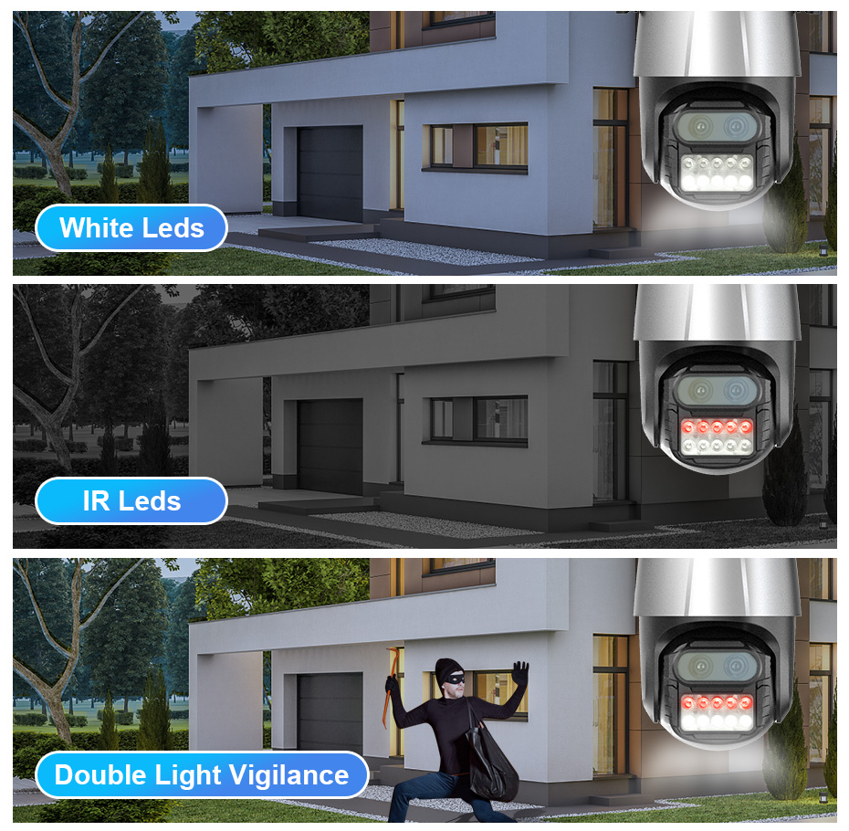 Встроенные 12 светодиодов, поддерживают полноцветный режим, инфракрасный режим и режим двойного освещения (инфракрасное ночное видение отображается, когда объект не движется, и белый свет будет включен, чтобы переключиться в полноцветный режим после обнаружения движения).