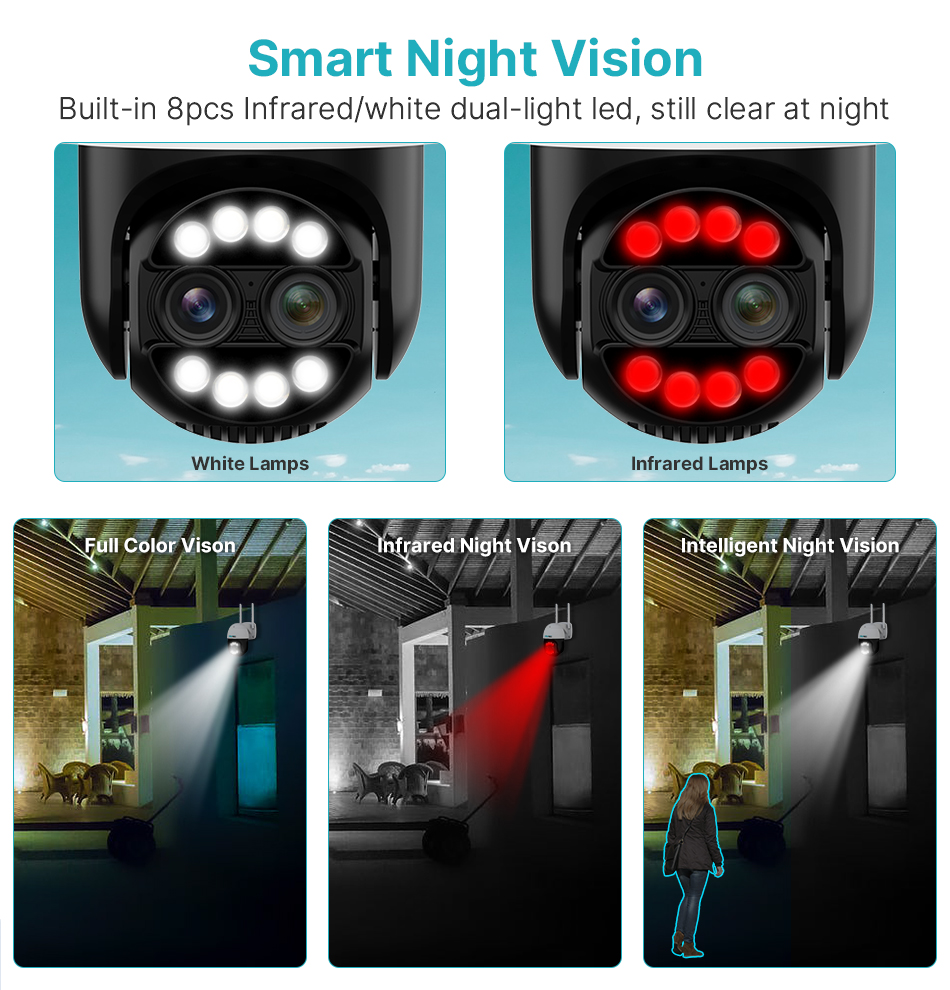 Встроенные белые светодиоды и светодиодные фонари с ИК-подсветкой, расстояние ночного видения до 50 метров, так что вы можете получать высококачественное видео даже ночью.