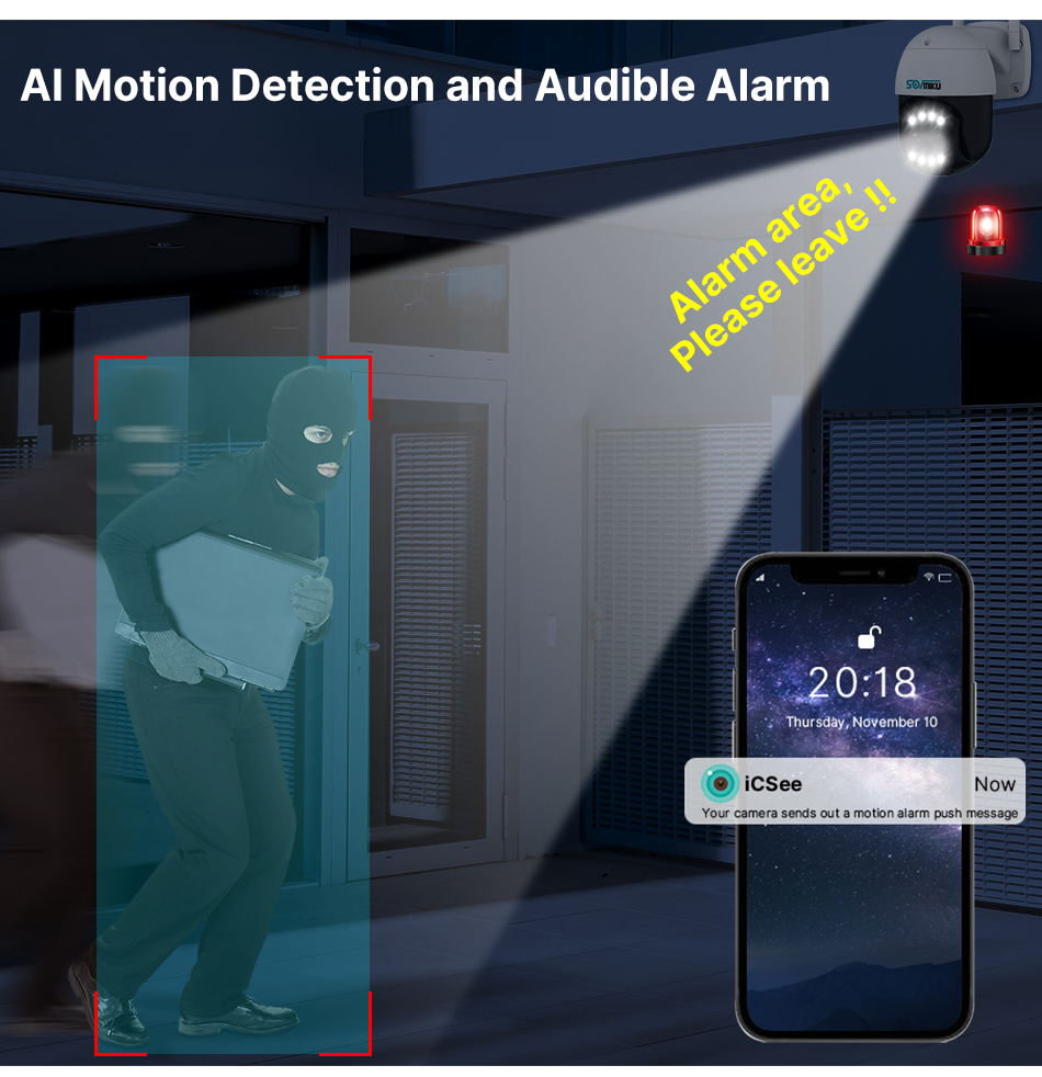 Когда камера видеонаблюдения 4K (2K) обнаружит движение человека ночью, она загорится белым светом и отправит уведомление