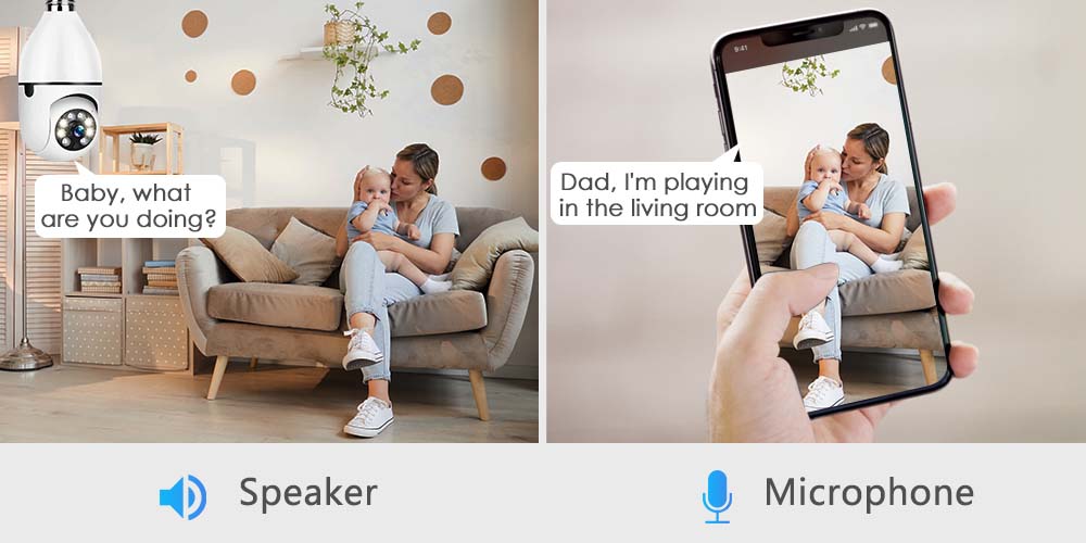 • Двусторонняя аудиосвязь:Камера с лампой оснащена двусторонней аудиосвязью, что позволяет вам общаться с кем угодно в вашем доме, что упрощает мониторинг и управление вашим пространством.