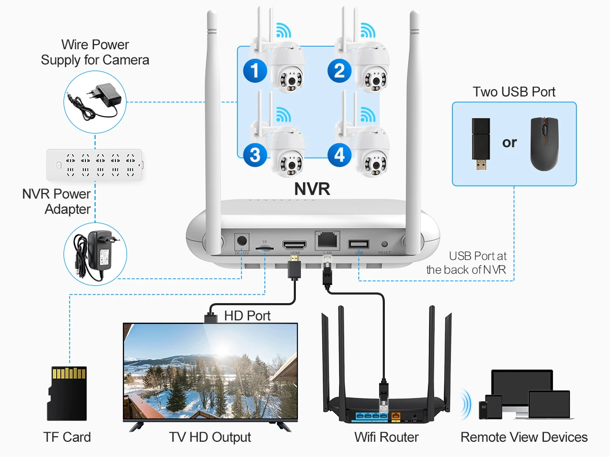 Наши камеры имеют встроенный слот для карт TF и поддерживают использование без Wi-Fi NVR.NVR поддерживает хранилище TF-карт/жестких дисков