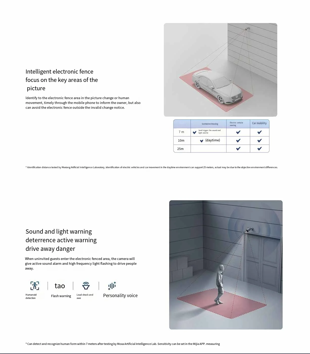 2. 【Захват гуманоида 】 Если кто-то ворвется в зону обнаружения, камера издаст звуковой сигнал высокого дБ и немедленно отправит уведомление о тревоге в приложение Mi Home.