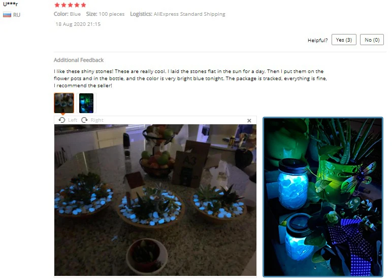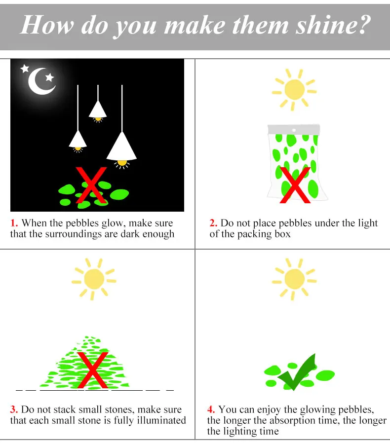 3. Когда галька светится, пожалуйста, убедитесь, что вокруг достаточно темно.