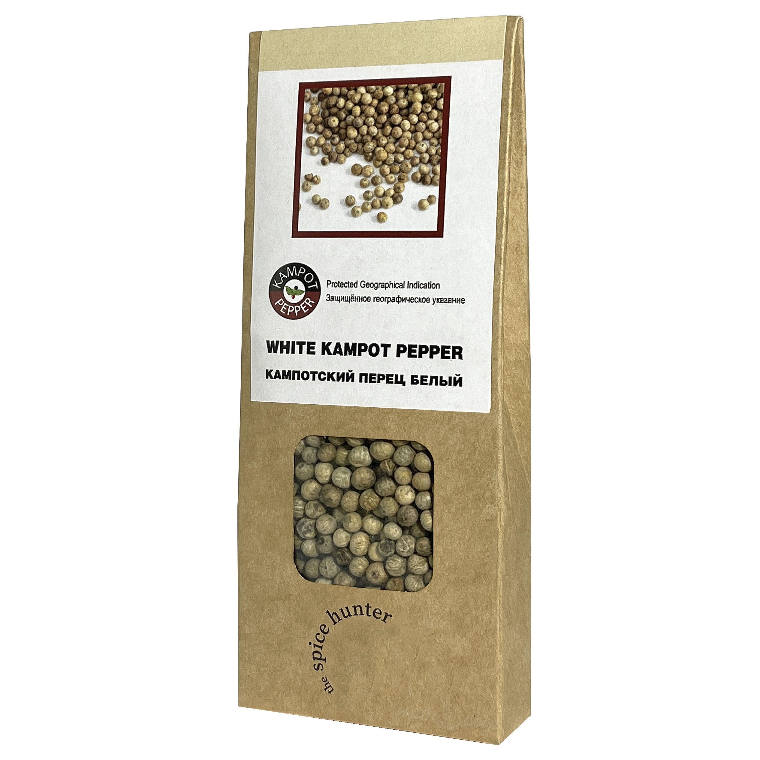 Белый кампотский перец отличается кремово-белым или бежевым цветом и настоящим перцовым ароматом с ментоловой ноткой. Во рту он приобретает интенсивный пряный вкус с нежными нотками свежих трав, эвкалипта, цитрусовых и розмарина.