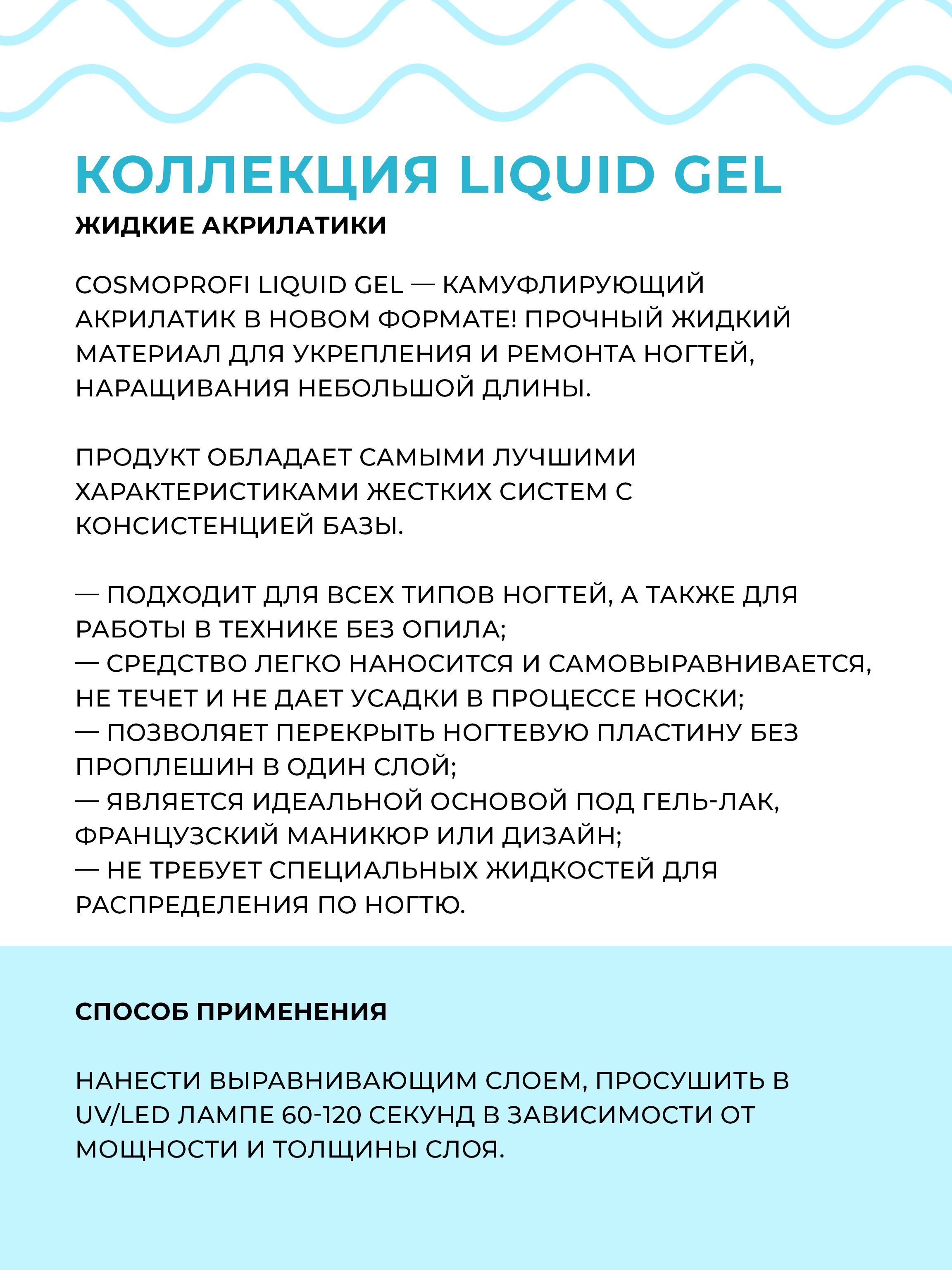 Описание: Cosmoprofi Liquid Gel — камуфлирующий акрилатик в новом формате! Прочный жидкий материал для укрепления и ремонта ногтей, наращивания небольшой длины. Продукт обладает самыми лучшими характеристиками жестких систем с консистенцией базы. Подходит для всех типов ногтей, а также для работы в технике без опила; Средство легко наносится и самовыравнивается, не течет и не дает усадки в процессе носки; Позволяет перекрыть ногтевую пластину без проплешин в один слой; Является идеальной основой под гель-лак, французский маникюр или дизайн; Не требует специальных жидкостей для распределения по ногтю. Способ применения: нанести выравнивающим слоем, просушить в UV/LED лампе 60-120 секунд в зависимости от мощности и толщины слоя . *Рекомендуем для лучшей сцепки наносить жидкий акрилатик на подложку из прозрачной базы.