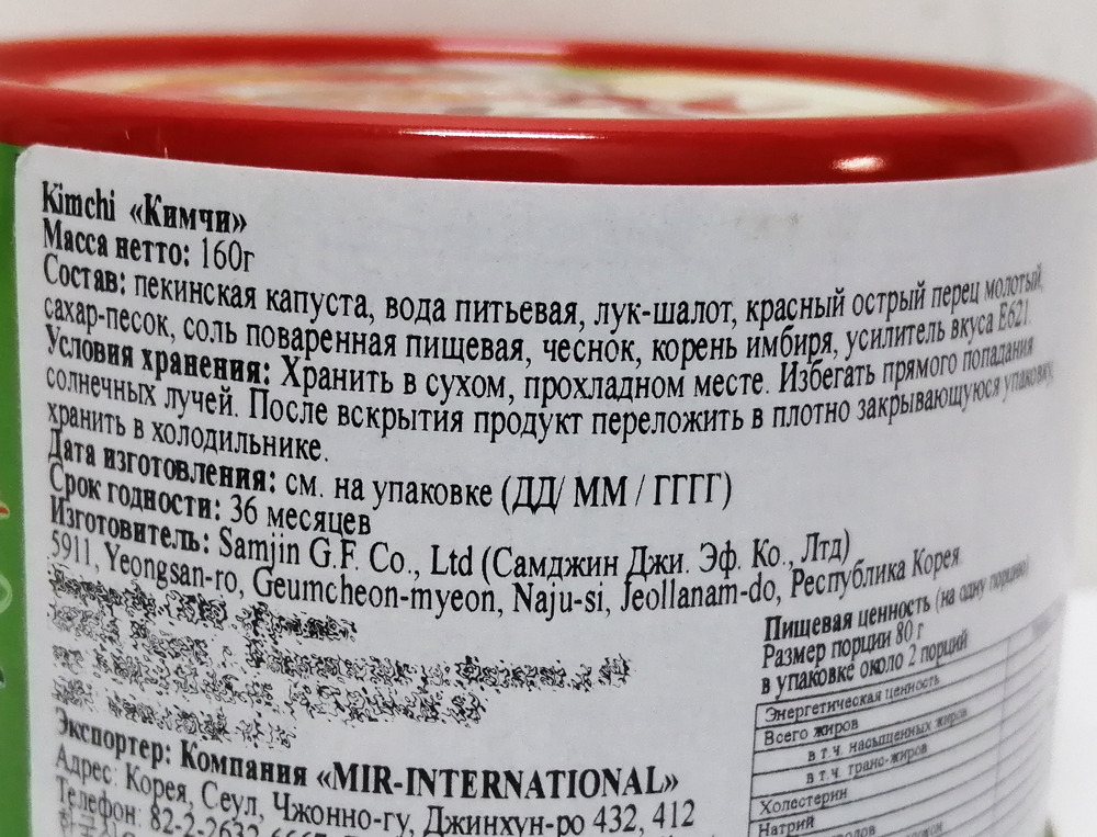 пекинская капуста, вода питьевая, лук шалот, красный острый перец молотый, сахар, соль, чеснок, корень имбиря, усилитель вкуса Е621.