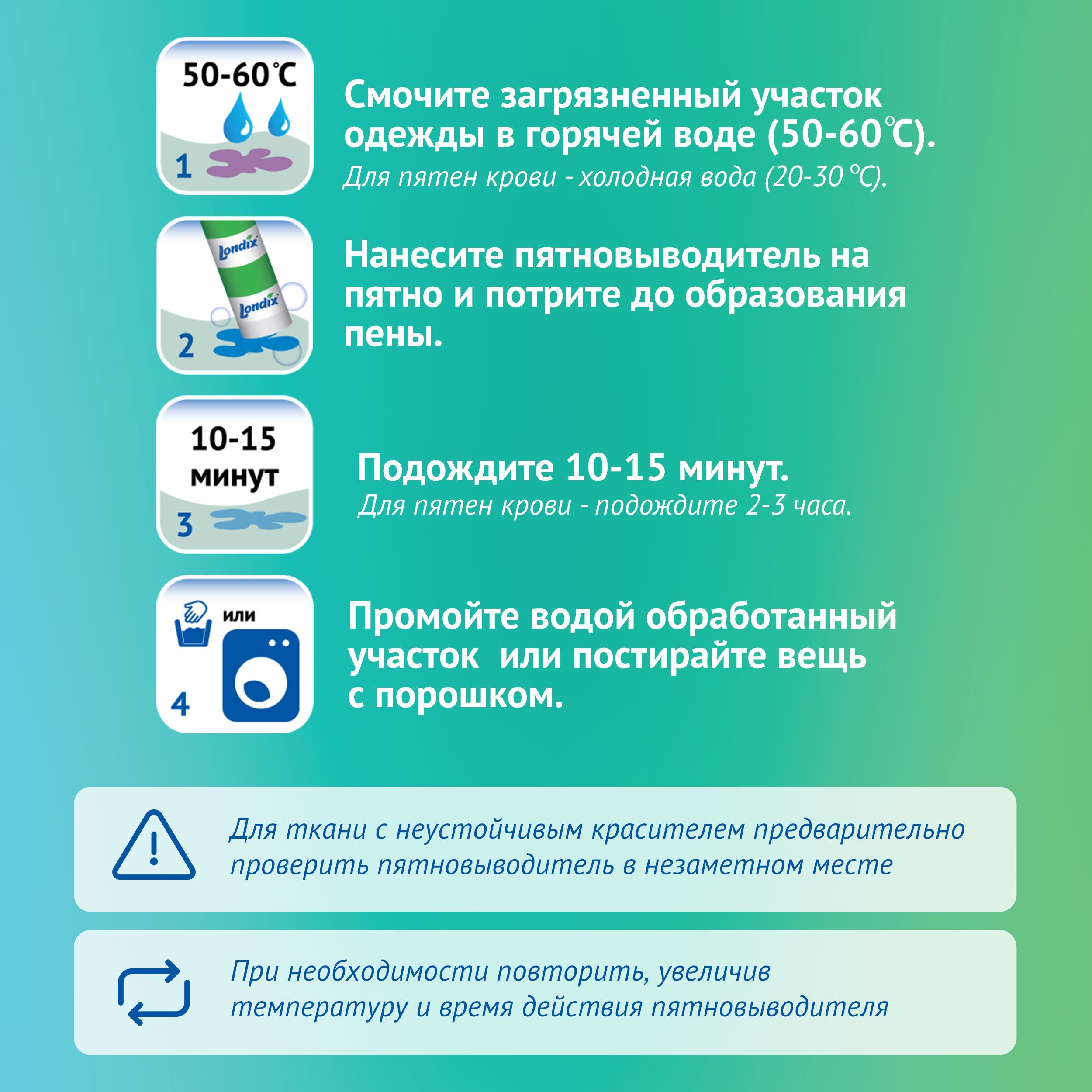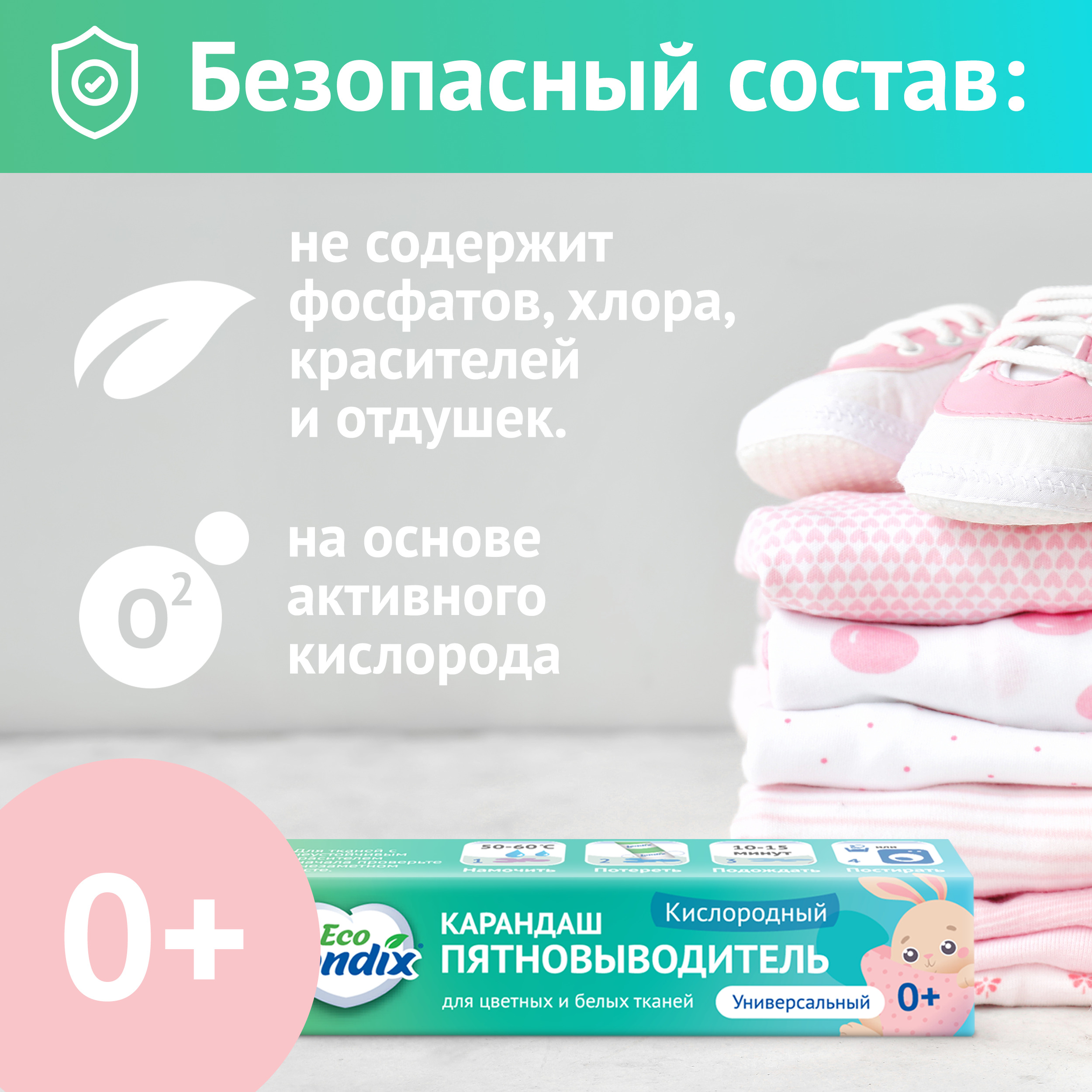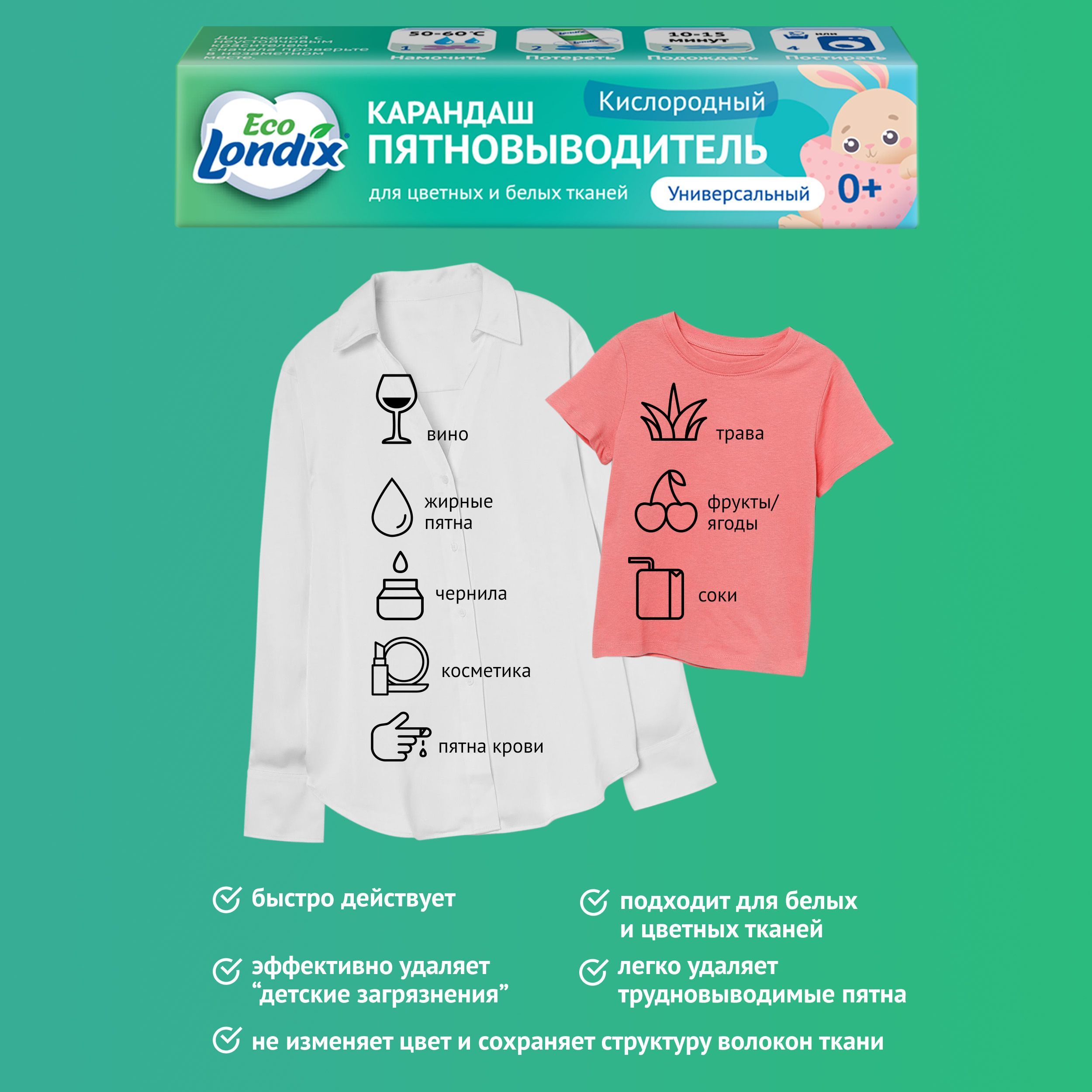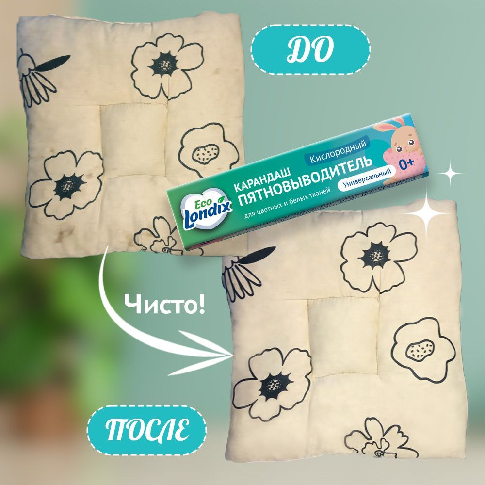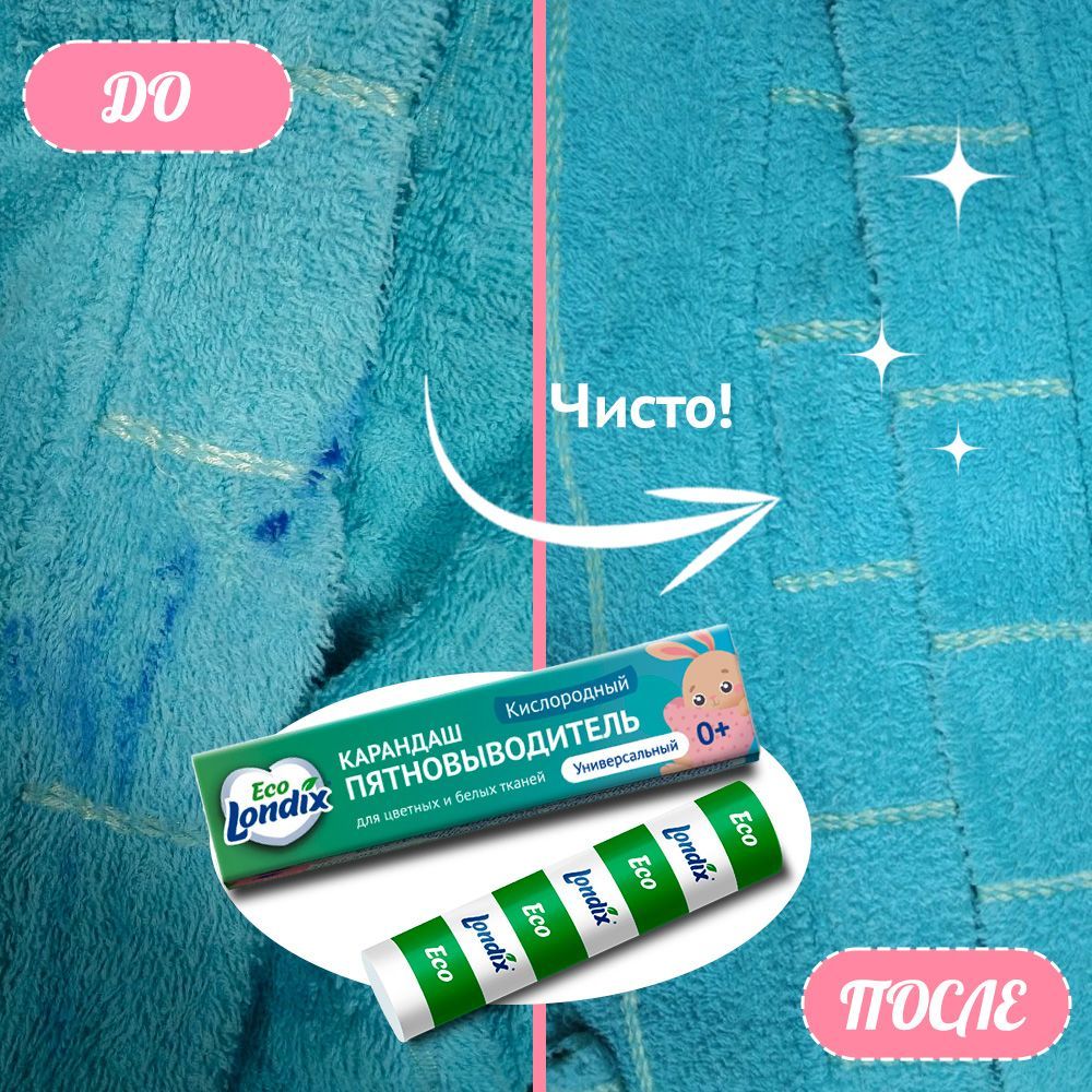 Кислородный отбеливатель пятновыводитель обладает безопасным составом: НЕ содержит фосфатов, хлора, красителей и отдушек.Без фосфатовБез хлораБез красителейБез отдушекВывести пятна с обувиНамочите тёплой (для синтетики) или горячей (для натуральных тканей) водой, нанесите карандаш и оставьте на 10-15 минут. Почистите щёткой или постирайте в машинке с гелем или порошком.Вывести старые пятна кофеНамочите горячей водой (максимально допустимой для ткани), нанесите карандаш от пятен и оставьте на 15-20 минут. При необходимости, усилить действие можно замачиванием с гелем\отбеливателем Londix. Удалить пятна гуаши с ткани махрового халатаНамочите в горячей воде, нанесите карандаш на 15-20 минут. При необходимости, усилить действие можно замачиванием с гелем\отбеливателем Londix. Выведение пятен с мебели (мебельные подушки)Намочите горячей водой (максимально допустимой для ткани), нанесите карандаш и оставьте на 15-20 минут. При необходимости, усилить действие можно замачиванием с гелем\отбеливателем Londix. Постирайте на деликатном режиме с гелем для стирки Londix.Удаление пятен от ягод (черника)Намочите горячей водой, нанесите карандаш и оставьте на 15-20 минут. Затем постирайте с детским порошком в стиральной машине при температуре воды от 60 градусов.Трудные загрязнения: воротники и манжетыНамочите горячей водой (максимально допустимой для ткани), нанесите карандаш и оставьте на 15-20 мин. Постирайте с гелем для стирки Londix.При использовании пятновыводителя карандаша не стоит забывать о важных правилах стирки, которые помогут убрать пятна, не испортив ткань: обязательно изучите символы по уходу за текстильными изделиями на вещах.Не используйте пятновыводитель, если его применение не разрешено на бирке.Компактный и удобныйКомпактный карандаш пятновыводитель для одежды удобен в хранении и экономичен в использовании, его удобно взять в поездку.