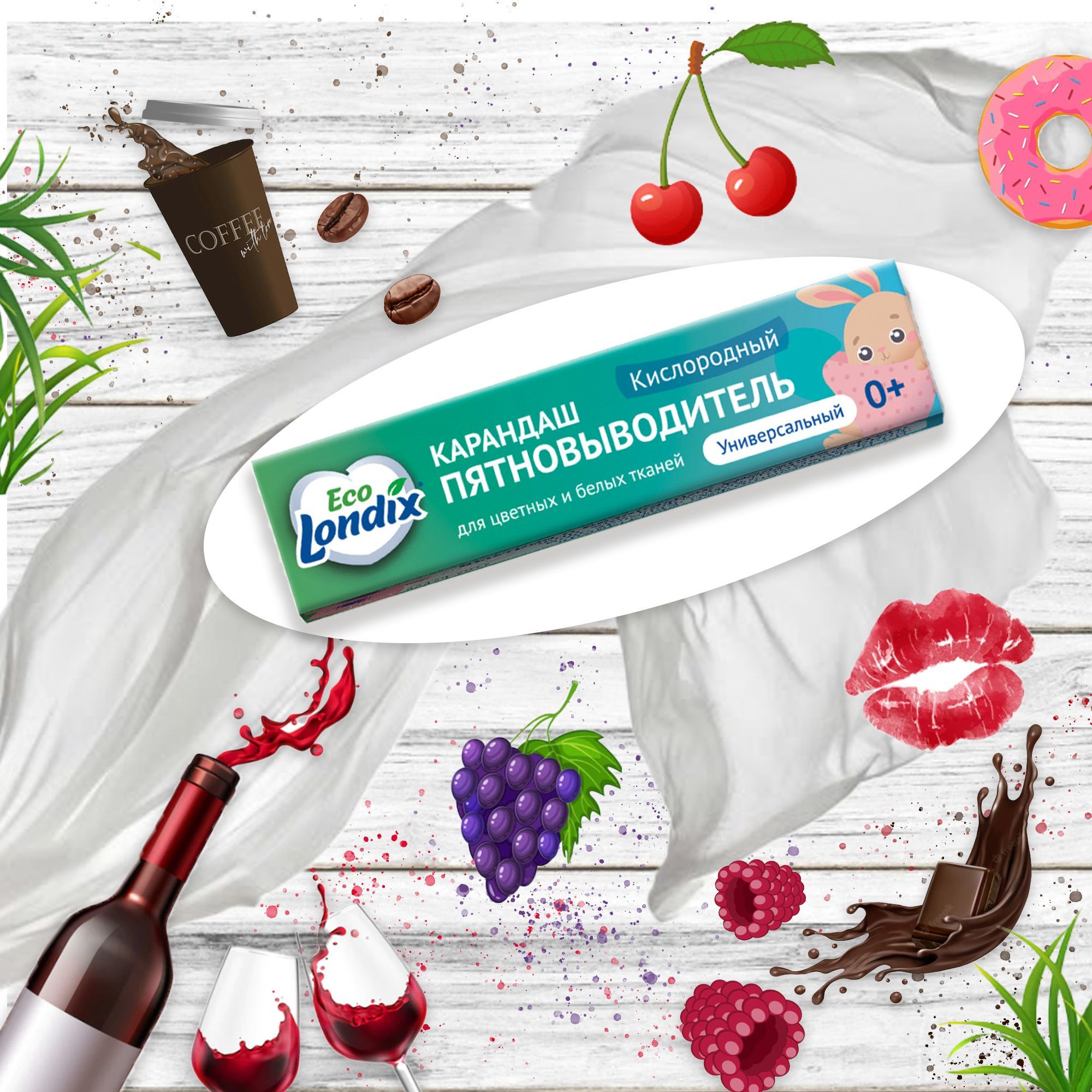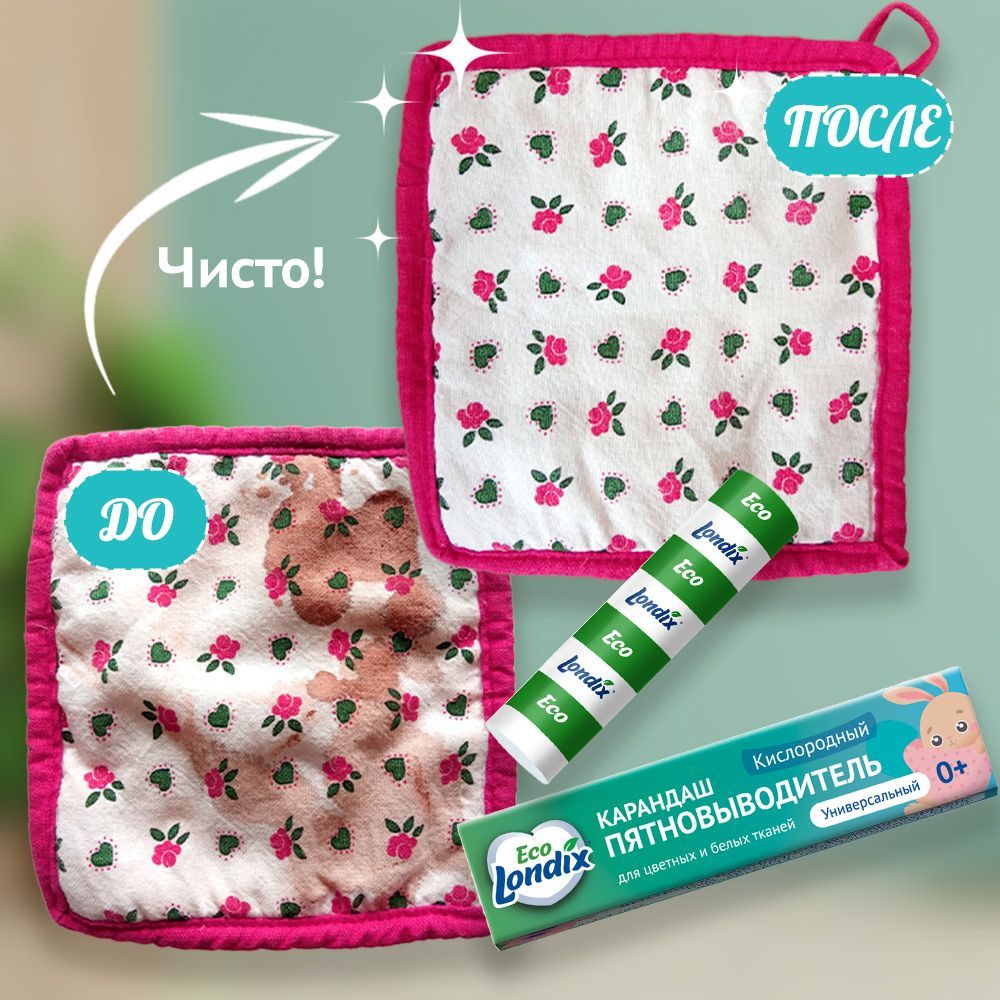 Описание: Универсальный кислородный карандаш пятновыводитель от LondixКислородный карандаш пятновыводитель Eco Londix быстро и эффективно удаляет с различных поверхностей трудновыводимые пятна от кетчупа, вина, кофе, чая, соков, фруктов, ягод, детского питания, фломастеров, зеленки, травы, губной помады, крови, сажи, нефтепродуктов, чернил и т.п.