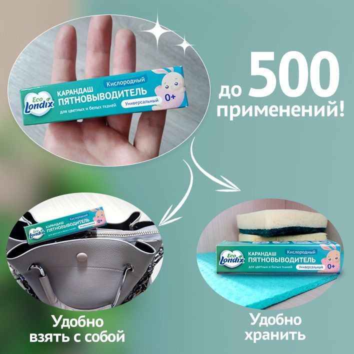 1 карандаша хватит, чтобы вывести до 500 пятен!В нашем магазине представлен широкий выбор средств для стирки: универсальный и детский стиральный порошок, гели для стирки, кондиционеры для белья, кислородный отбеливатель, средство для стирки спортивной и верхней одеждыПереходите на страницу нашего бренда, чтобы ознакомиться с полным ассортиментом бытовой химии для дома Londix!