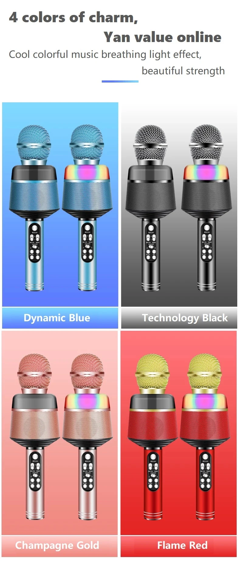 【Веселый микрофон для караоке 】-Интересный микрофон с танцующими огнями. Огни красивые и яркие, но не ослепляющие, и они прыгают от музыки. Функции изменения голоса-это весело! Это может быть оригинальный голос, детский голос, женский голос, мужской голос.