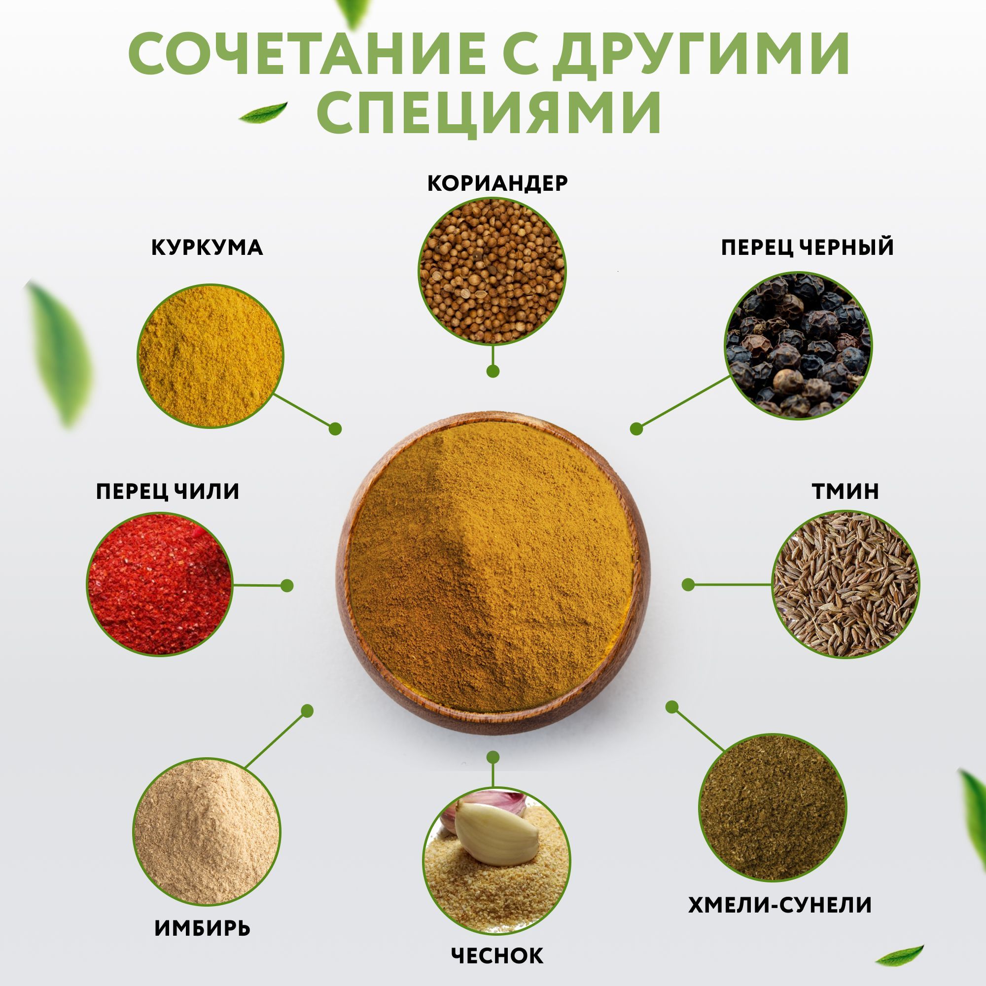 Кориандр, чеснок, пажитник, куркума молотая, перец черный,соль, имбирь, горчица молотая, перец душистый, перец чили, гвоздика молотая, мускатный орех, кумин