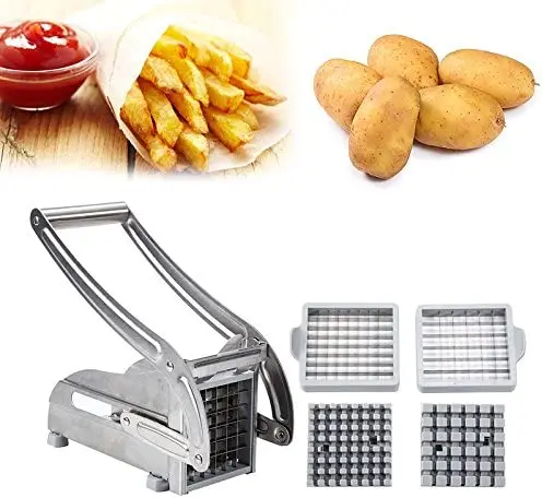 4: Two cutting sizes: Use the included two stainless steel interchangeable blades to quickly and easily slice potatoes and other vegetables. The large blade produces 36 steak fryers that are 1/2" or 13mm thick. The small blade yields 64 thin fries 3/8" thick or 10mm thick. The maximum length of each fry is 7.62 cm.