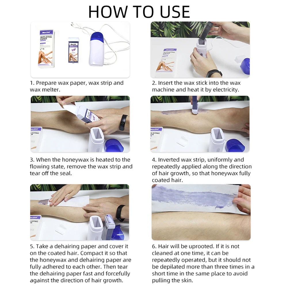 2. Когда воск находится в плавном состоянии, Налейте его в емкость, чтобы жидкий воск вытекал из роликового сопла. Роликовая трубка катится по направлению роста волос, равномерно покрывается восковым слоем, затем восковой слой покрывается вощеной бумагой для депиляции, прижимается вручную. Фактически, сделайте так, чтобы воск полностью прилипал к бумаге для депиляции, а затем быстро Оторвите бумагу для депиляции против направления роста волос, обнаружите, что волосы будут удалены.