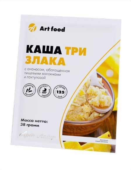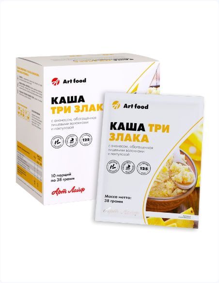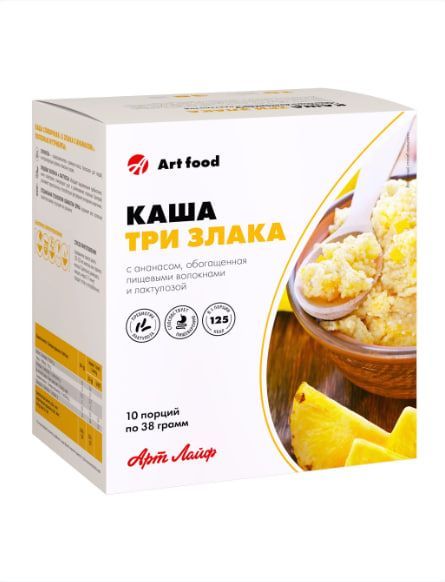 Описание: Каша 3 злака с ананасом низкокалорийная, 10 пак. по 38 гр.Все мы знаем, как важен завтрак для правильного обмена веществ, красивой фигуры и отличного самочувствия. Но чаще всего желание поспать утром берет верх над здоровыми привычками. Каша быстрого приготовления поможет легко решить эту проблему. Источник ценного растительного белка, медленных углеводов, клетчатки и полезных фитонутриентов отлично насыщает и помогает контролировать аппетит продолжительное время. Каши компании "Артлайф" производятся по особой технологии из микронизированных хлопьев, что позволяет сохранить максимальное количество полезных веществ в готовом продукте. Каша не содержит сахара, поэтому подходит людям, контролирующим уровень глюкозы в крови и массу тела, благодаря лактулозе обеспечивает поддержку микрофлоры и регулярное очищение кишечника.
