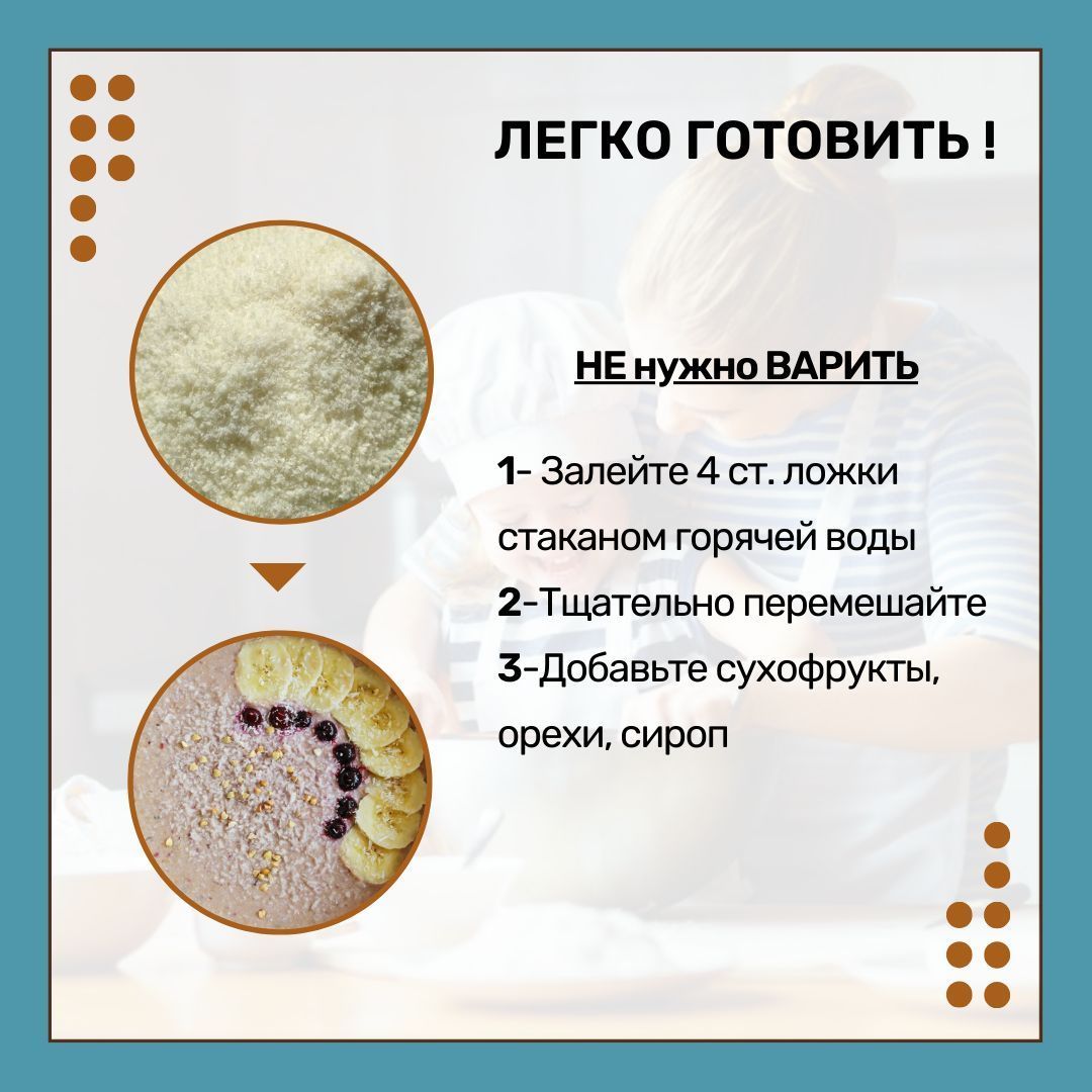 Плюс каши в том, что она не требует варки, а, значит, здорово экономит время с утра! Просто залейте 4 столовые ложки (40г) горячей водой (200мл) и тщательно перемешайте! По желанию можно добавить сухофрукты, орешки, сироп.
