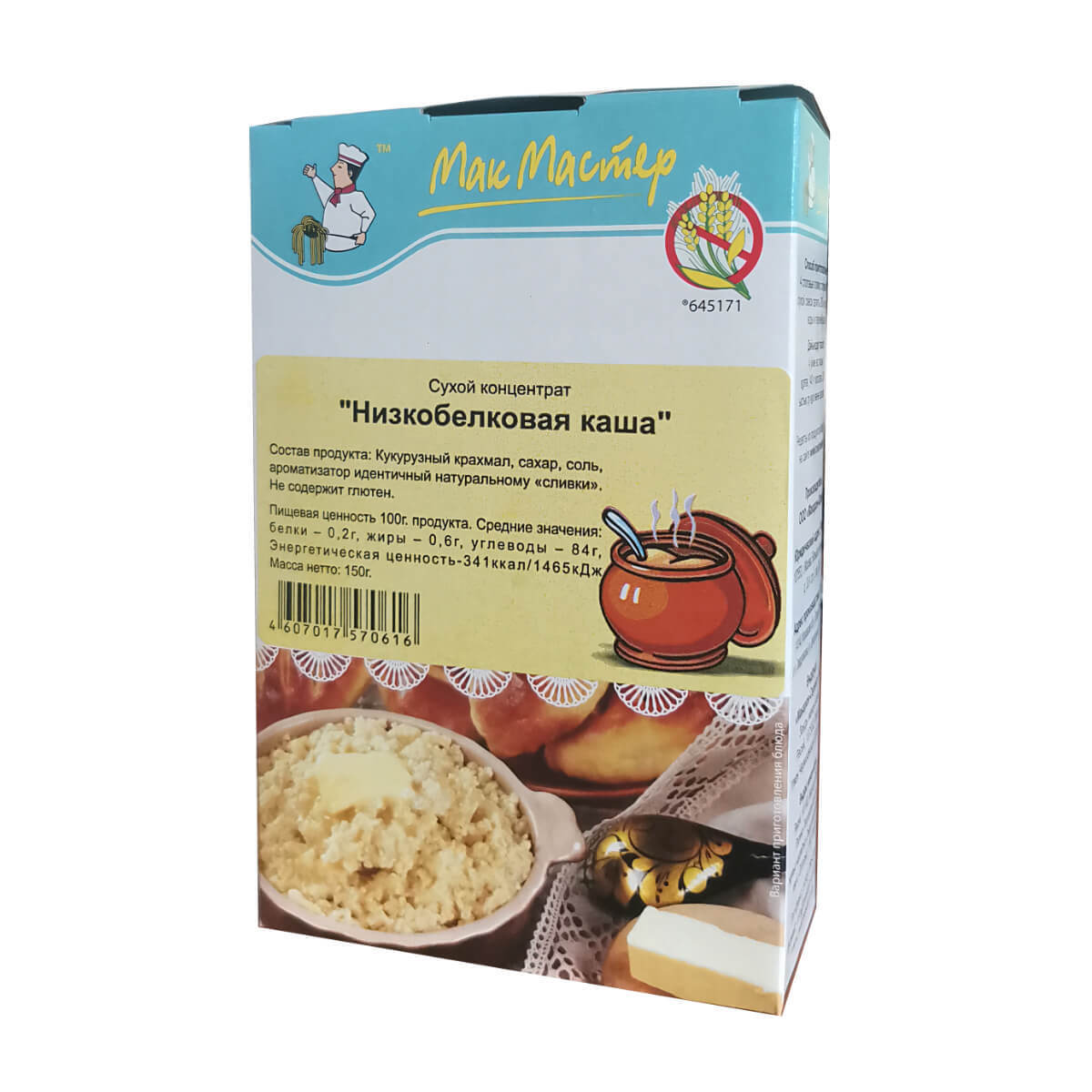 Описание: Низкобелковая каша Макмастер - идеальное решение для вкусного безглютенового и безбелкового завтрака! Подойдет для людей с фенилкетонурией (ФКУ). Плюс каши в том, что она не требует варки, а, значит, здорово экономит время с утра! Просто залейте 4 столовые ложки (40г) горячей водой (200мл) и тщательно перемешайте! По желанию можно добавить сухофрукты, орешки, сироп.