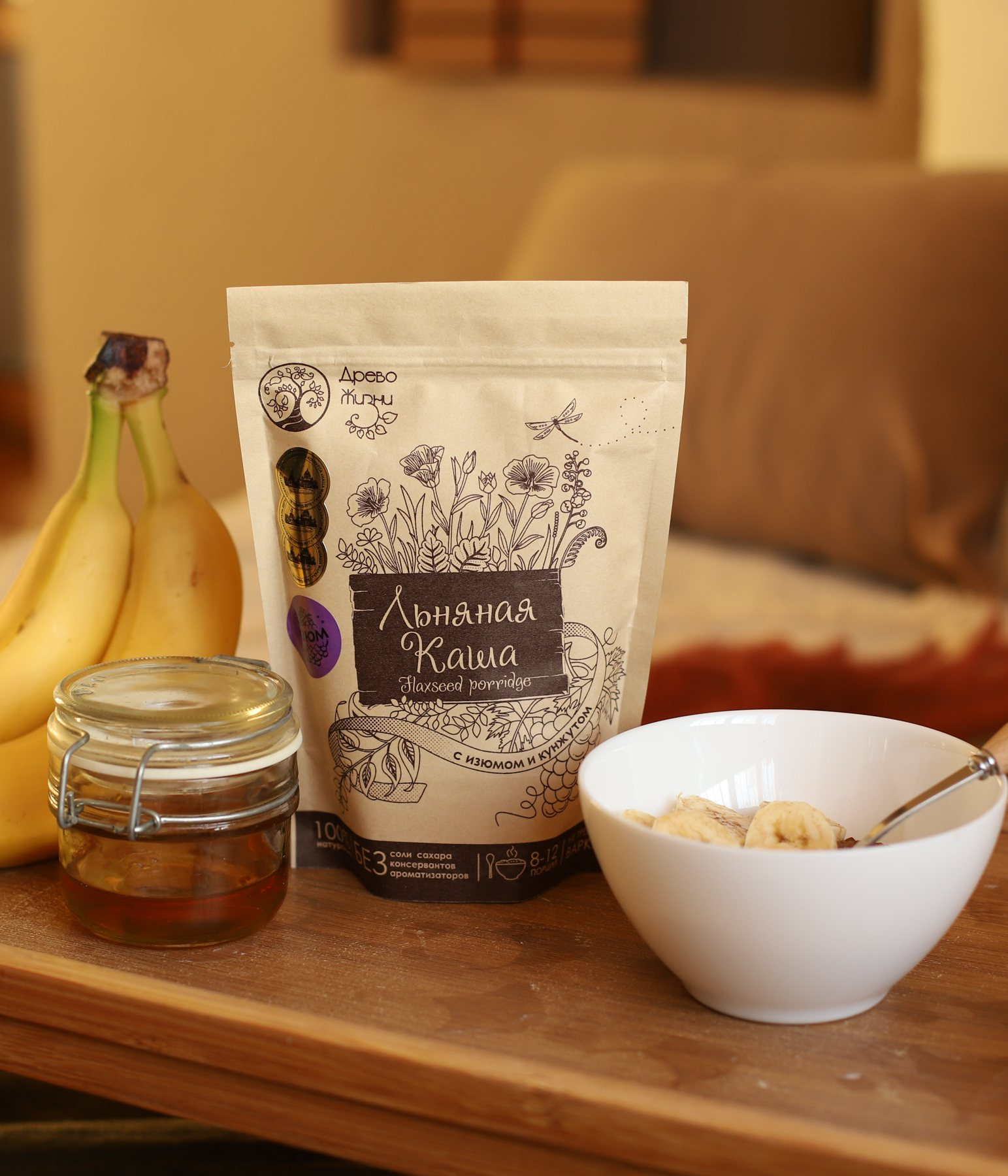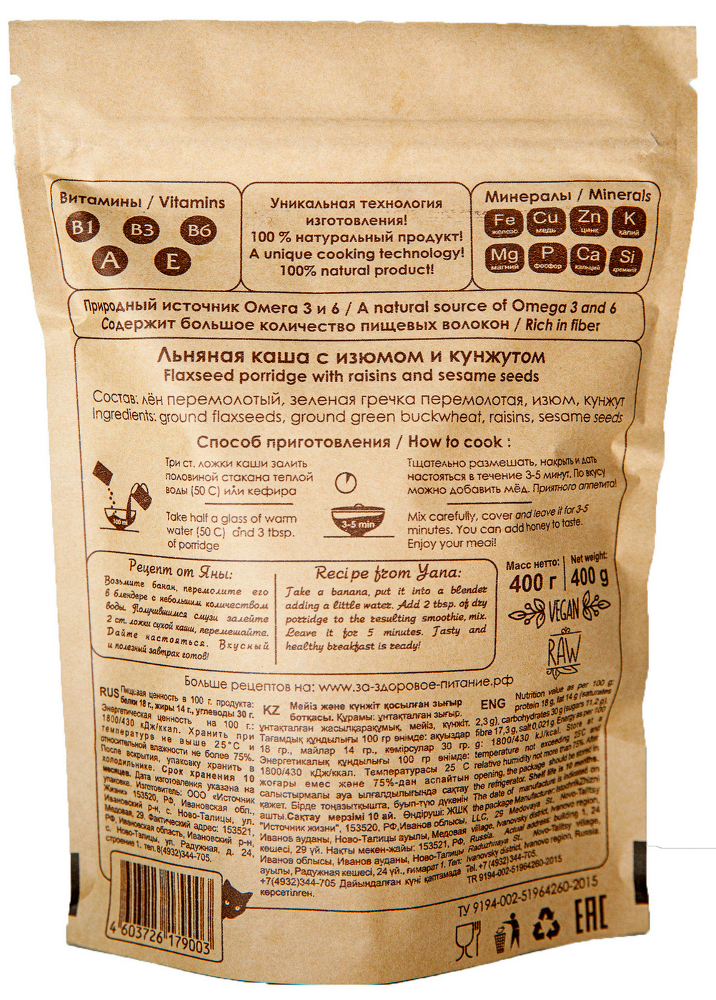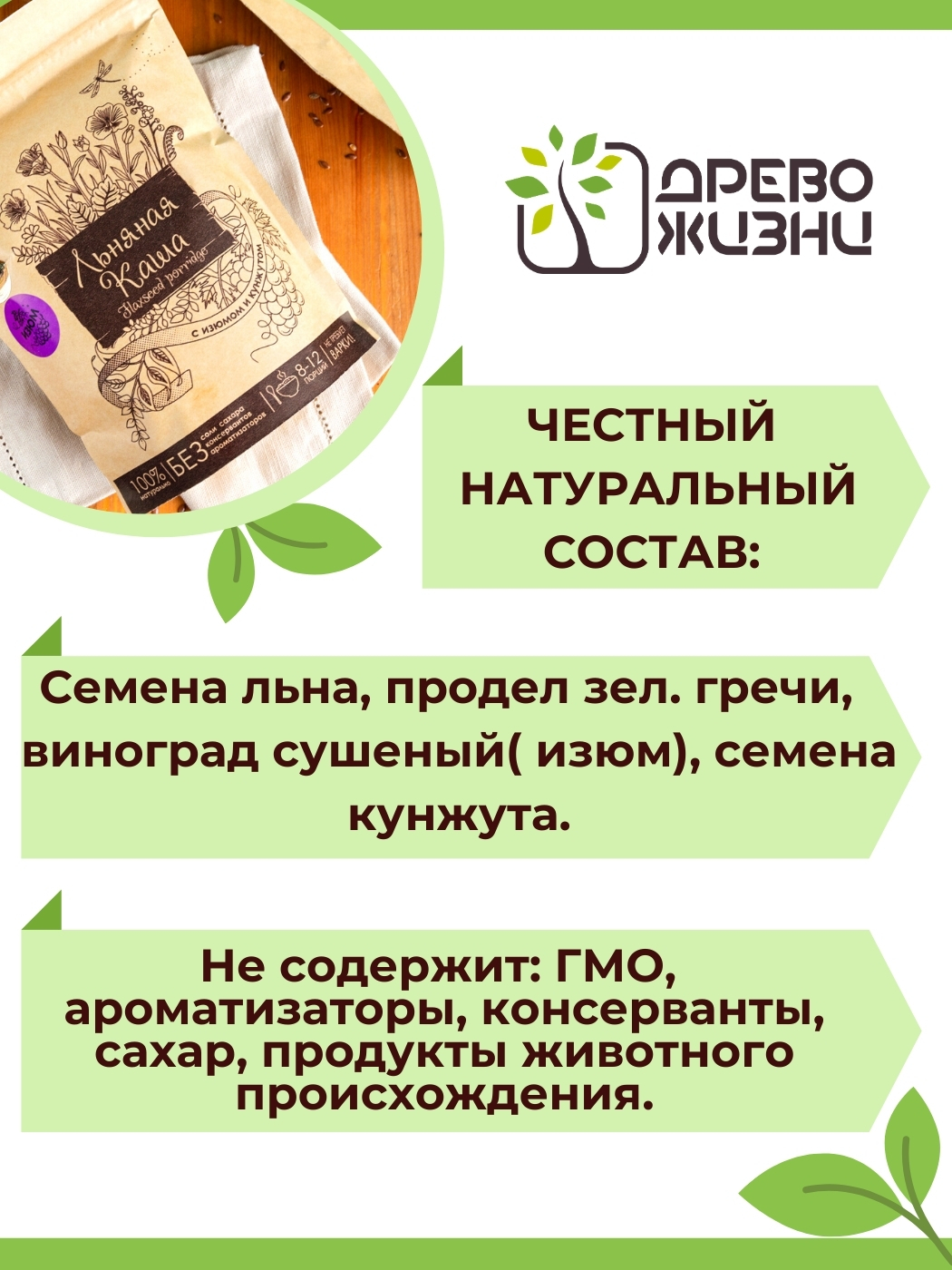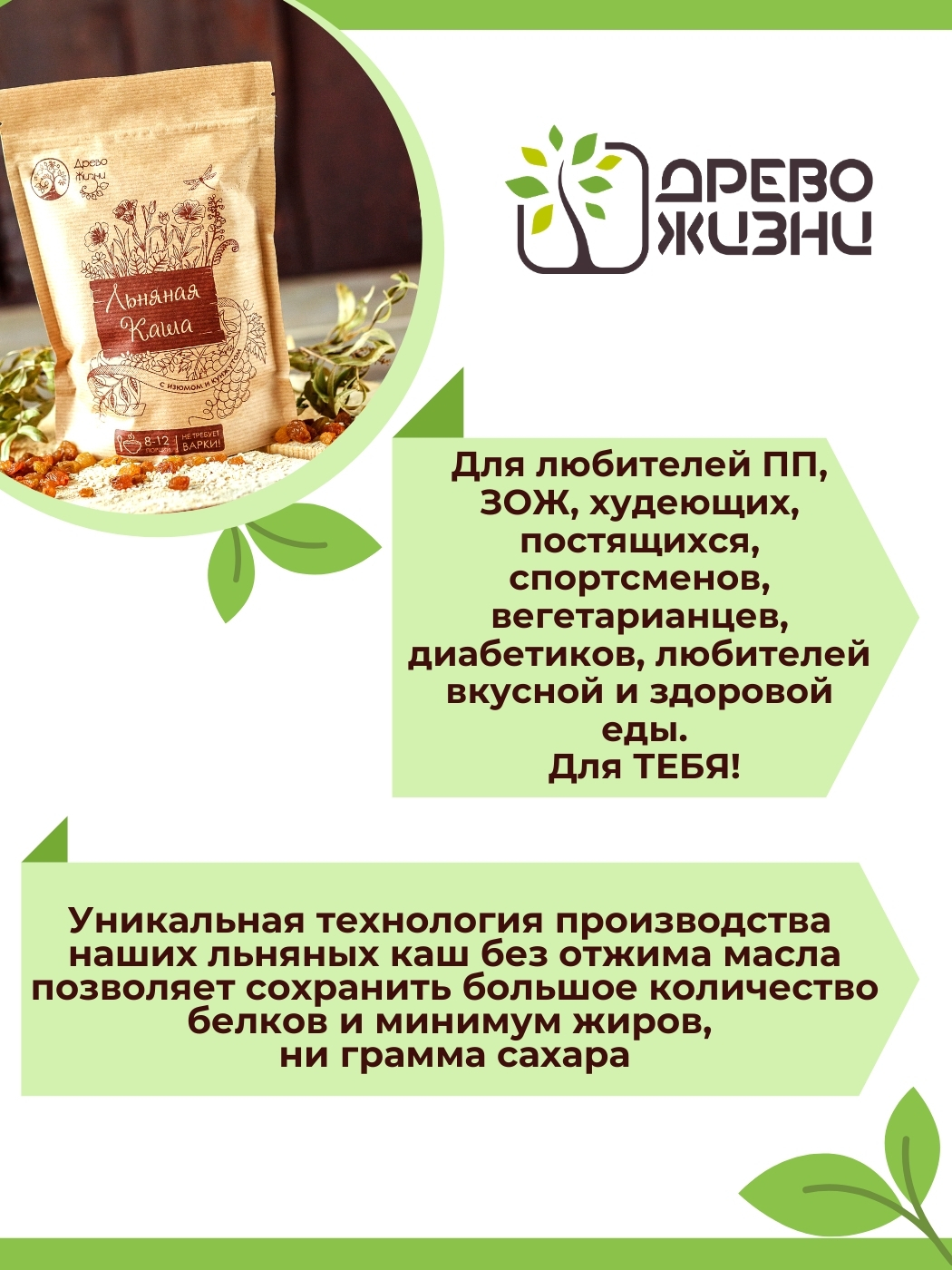 Описание: Наша льняная каша с изюмом и кунжутом богата содержанием витаминов группы В, С и А, калия, хрома, кремния, бора, селена, железа, цинка, меди, натрия, марганца, кальция, и фосфора. Сочетание изюма и кунжута традиционно используется для похудения и поддержания организма в тонусе, в пост. А в зелёной гречке содержится большое количество антиоксидантов, которые повышают иммунитет и тормозят процессы старения. В меру сладкий изюм естественной сушки, перемолотое льняное семя, зеленая гречка и кунжут - в составе ничего лишнего. Льняная каша из тёмного льна готовится без отжима масла — льняное семя перемалывается по авторской рецептуре. Благодаря этому оно приятнее на вкус и содержит намного больше очень нужных организму полиненасыщенных жирных кислот и витаминов, чем каши из льняной муки. Эту кашу не нужно варить, ее достаточно просто залить тёплой водой или кефиром — и быстрый и здоровый завтрак готов! Также кашу можно добавлять в оладьи и драники вместо муки и использовать её как панировку для сладостей или сырников.   Все наши полезные льняные каши производятся без добавления сахара, соли, консервантов, красителей и ароматизаторов. Семена льна, а значит и наша каша быстрого приготовления, не содержат глютен. Подходят для вегетарианцев, веганов, диабетиков, для людей на диете, любителей правильного здорового питания, для взрослых и для детей.  Способ приготовления: залить сухую льняную кашу теплым молоком, водой, соком или йогуртом. При желании можно добавить немного масла, фруктов или орехов. Вкусная полезная каша готова! Приятного аппетита!